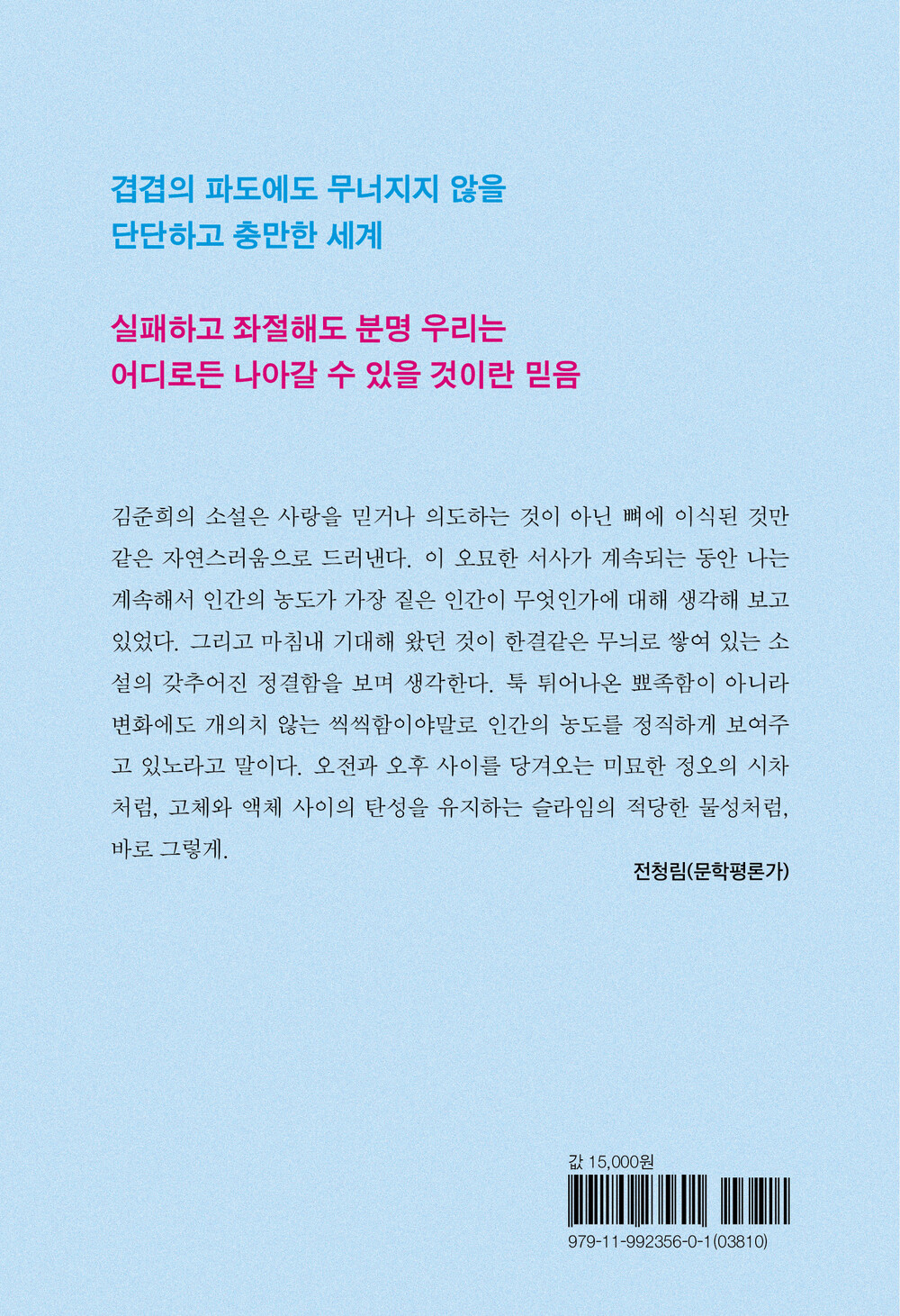 압도적으로 높은 파도 앞에 선 것처럼, 위태로운 출발 지점에 선 것처럼 온몸이 휘청거리는 긴장 속에서도 한 줄기의 맹렬한 신뢰를 보여준 김준희의 소설은 주저하지 않는 사랑이 무엇인지에 대해 알려주었다. 그 사랑은 악역으로 보였던 인물을 서서히 존중받게 만드는 치열한 고민 속에서, 무기력한 아픔을 뚫고 타인에게 공감하고 존중할 줄 아는 겸손 속에서, 남모를 이에게 무운을 빌어줄 줄 아는 성숙함 안에서 등장한다. 우리가 믿고 싶은 근본적인 인간 신뢰가 계속되는 불운과 무기력한 상황을 헤치고 서서히 드러날 때, 있는 듯 없는 듯, 깊은 지하 속에 파묻혀 있는 것만 같은 그것이 살살 먼지를 털고 등장할 때 김준희의 소설은 사랑을 믿거나 의도하는 것이 아닌 뼈에 이식된 것만 같은 자연스러움으로 드러낸다. 이 오묘한 서사가 계속되는 동안 나는 계속해서 인간의 농도가 가장 짙은 인간이 무엇인가에 대해 생각해 보고 있었다. 그리고 마침내 기대해 왔던 것이 한결같은 무늬로 쌓여있는 소설의 갖추어진 정결함을 보며 생각한다. 툭 튀어나온 뾰족함이 아니라 변화에도 개의치 않는 씩씩함이야말로 인간의 농도를 정직하게 보여주고 있노라고 말이다. 오전과 오후 사이를 당겨오는 미묘한 정오의 시차처럼, 고체와 액체 사이의 탄성을 유지하는 슬라임의 적당한 물성처럼, 바로 그렇게.