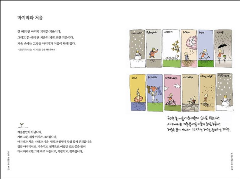 이렇게 4장으로 나뉘어 있지만, 책의 어느 부분을 펼쳐도 한 줄 글에서, 한 컷의 그림에서 행복, 희망, 사랑, 가족, 친구, 응원 등 우리 삶의 귀중한 가치들을 만나게 될 것이다.