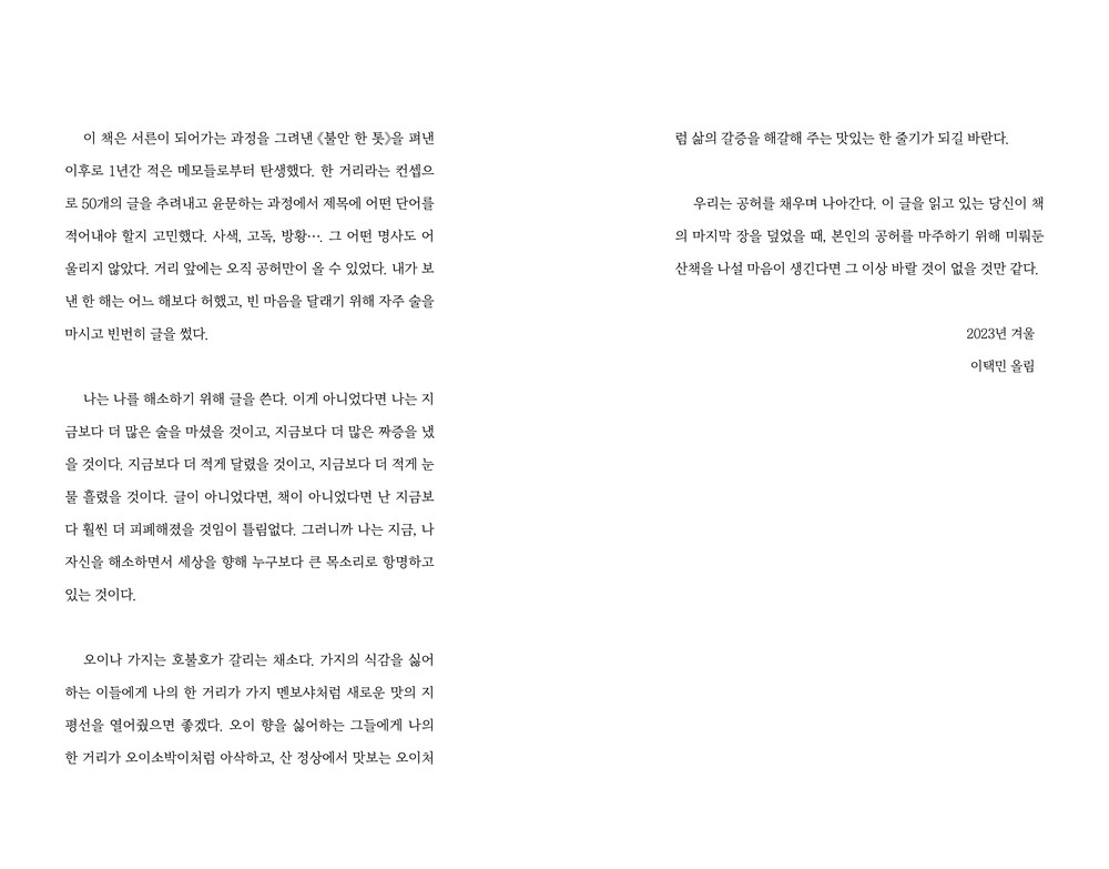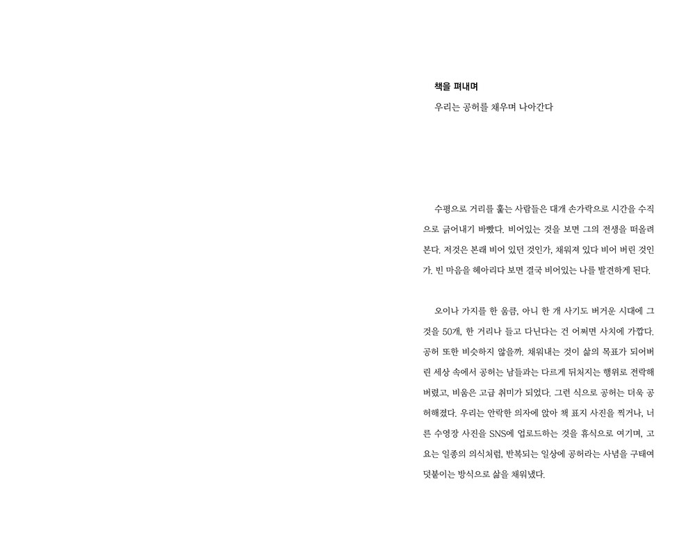 이렇듯 공허가 사치가 된 시대에, 빈 마음을 사색으로 채우며 적어낸 50편의 글과 40편의 단상을 수록하였다.