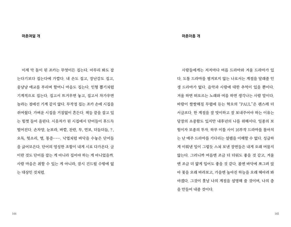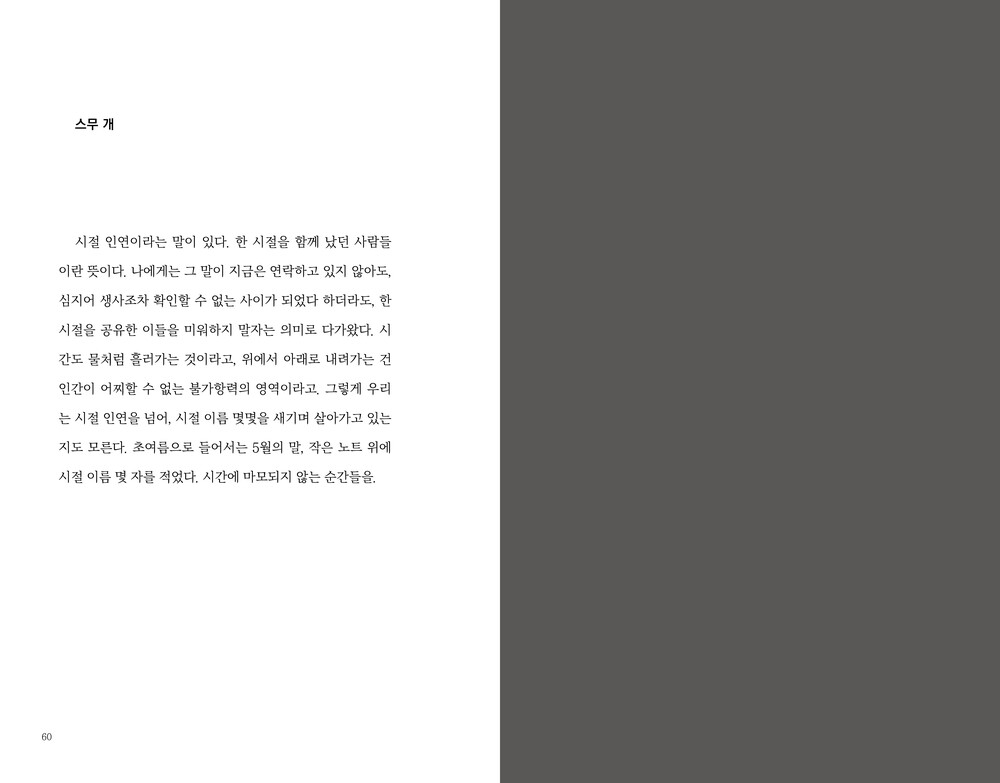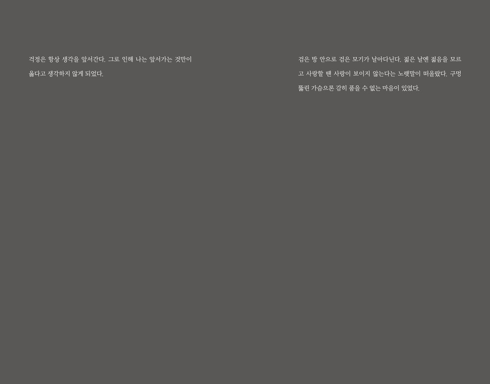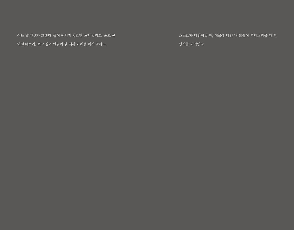표정을 감추고, 마음을 숨기고, 감정을 죽이고, 행동을 멈추고, 나를 지운다. 나는 나를 참지 않고 선뜻 내보이고 싶은데, 진짜 나를 받아줄 사람은 없는 것만 같아, 진짜 나였던 시절을 종종 그리워한다. 돌아갈 수 없던 그 시절을, 돌아갈 수 없는 그 품을.