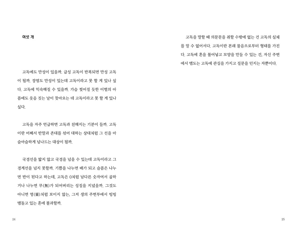 고독을 말할 때 의문문을 취할 수밖에 없는 건 고독의 실체를 알 수 없어서다. 고독이란 본래 물음으로부터 형태를 가진다. 고독에 혼을 불어넣고 모양을 만들 수 있는 건, 자신 주변에서 맴도는 고독에 관심을 가지고 질문을 던지는 자뿐이다.