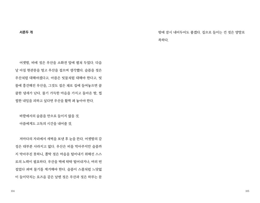 바다에서 하늘로, 하늘에서 다시 땅으로 내려온 비를 보며 나는 나를 다시 되돌아본다. 걸어온 길, 마셨던 술, 뱉어낸 말. 명확하지 않아 발자국을 되짚어갈 수 없음에, 한 번 취한 자는 또다시 취할 수 없음에, 꺼낸 말을 도로 돌릴 수 없음에. 나는 영원한 이별이다. 내게 안녕은 영원한 작별이다.
