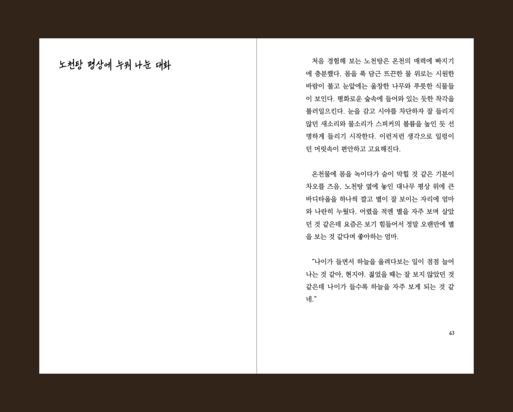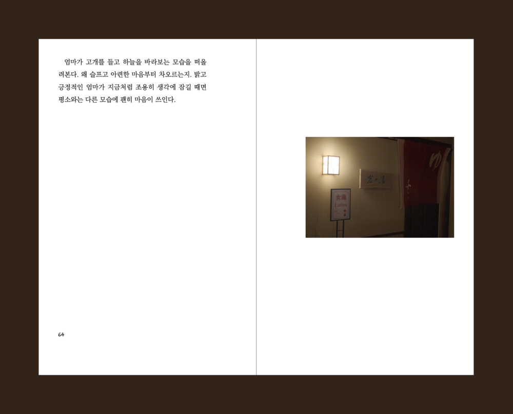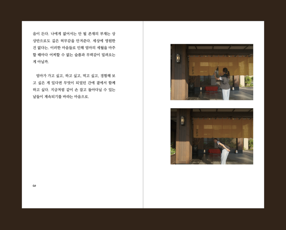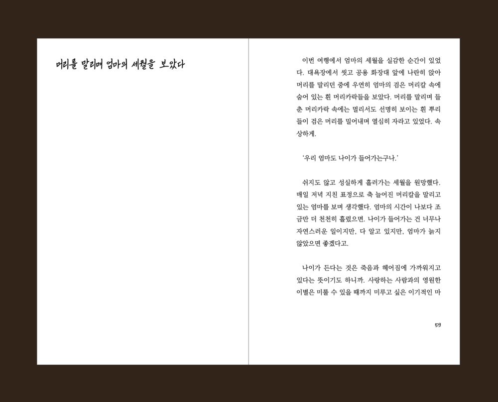 엄마의 세월을 여러 번 마주하며 슬픔과 무력감을 느끼기도, 소녀 같은 모습에 사랑스러움을 느끼기도 했습니다.