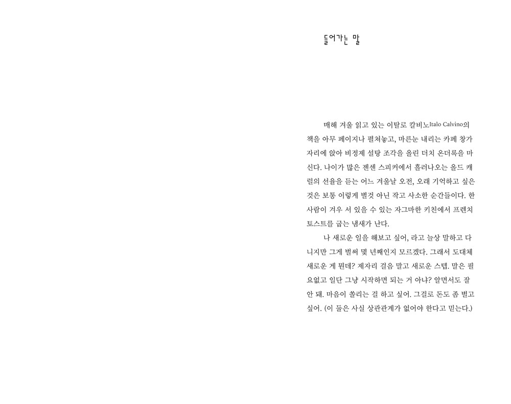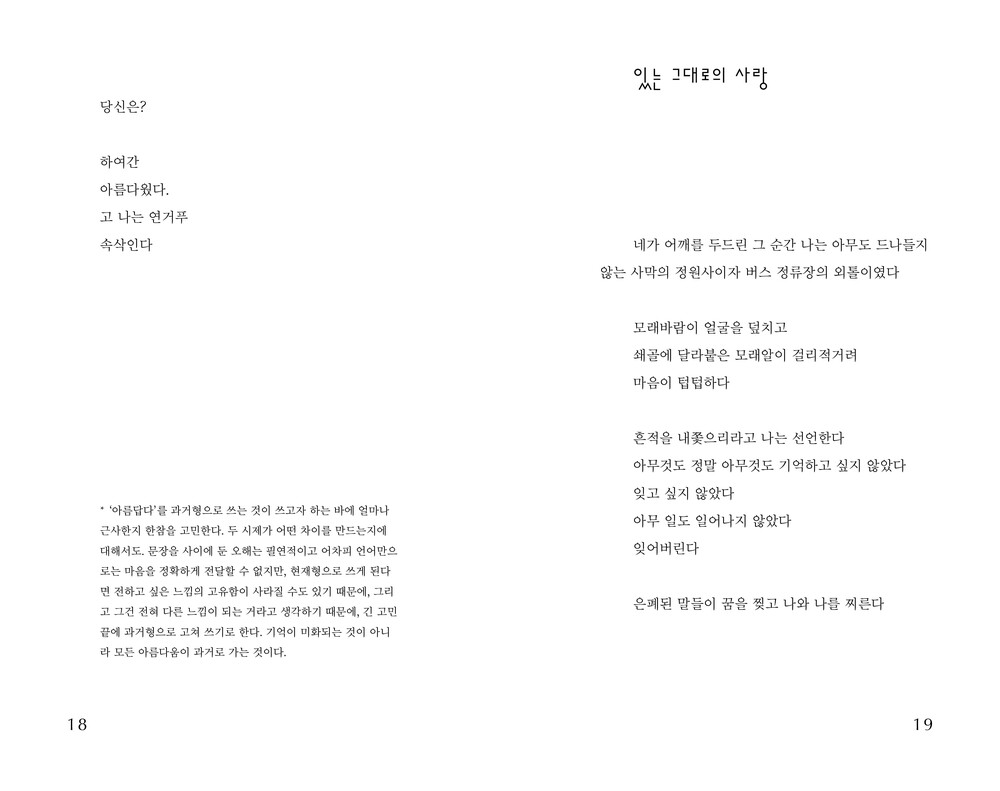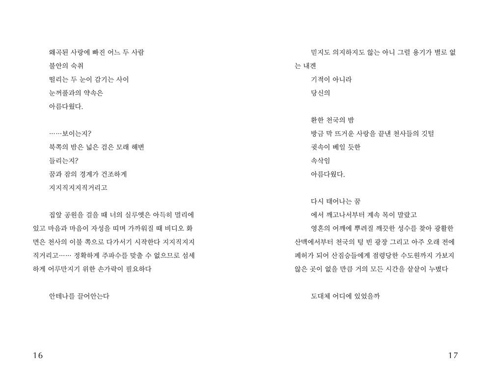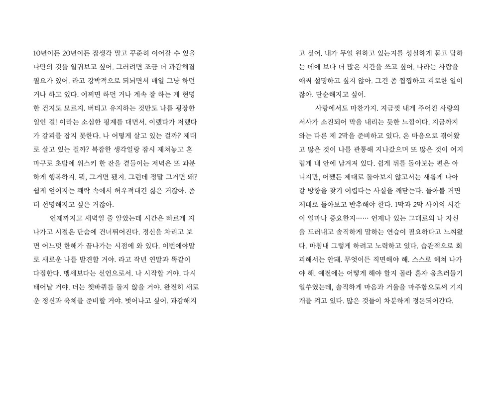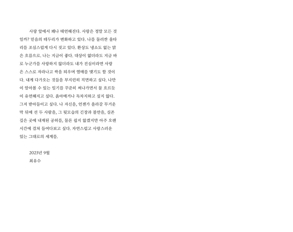 사랑 앞에서 꽤나 태연해진다. 사랑은 정말 모든 것일까? 믿음의 테두리가 변화하고 있다. 나를 둘러싼 울타리를 조심스럽게 다시 짓고 있다. 환상도 냉소도 없는 맑은 흐름으로. 나는 지금이 좋다. 대상이 없더라도 지금 바로 누군가를 사랑하지 않더라도 내가 진심이라면 사랑은 스스로 자라나고 싹을 틔우며 열매를 맺기도 할 것이다. 내게 다가오는 것들을 부지런히 직면하고 싶다. 나만이 알아볼 수 있는 일기를 꾸준히 써나가면서 물 흐르듯이 유연해지고 싶다. 옭아매거나 독차지하고 싶지 않다. 그저 받아들이고 싶다. 나 자신을, 언젠가 올라갈 무거운 막 뒤에 선 두 사람을, 그 뒷모습의 긴장과 불안을, 실존 깊은 곳에 내재된 공허를, 물론 쉽지 않겠지만 아주 오랜 시간에 걸쳐 들여다보고 싶다. 자연스럽고 사랑스러운 있는 그대로의 세계를.