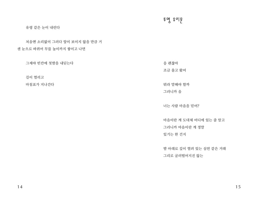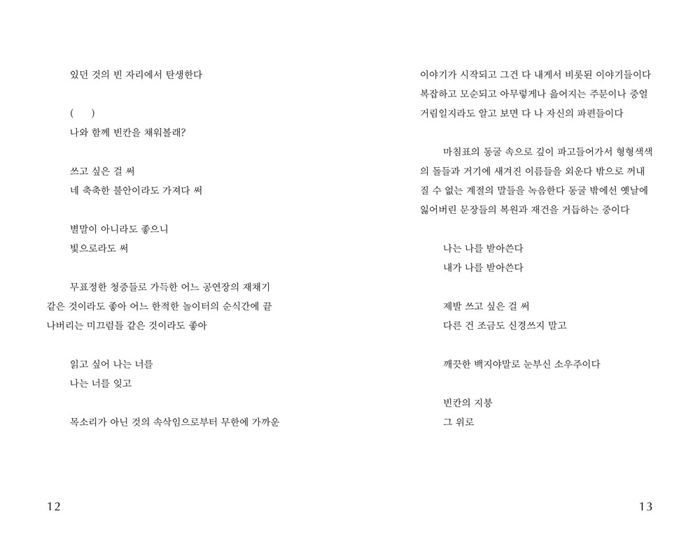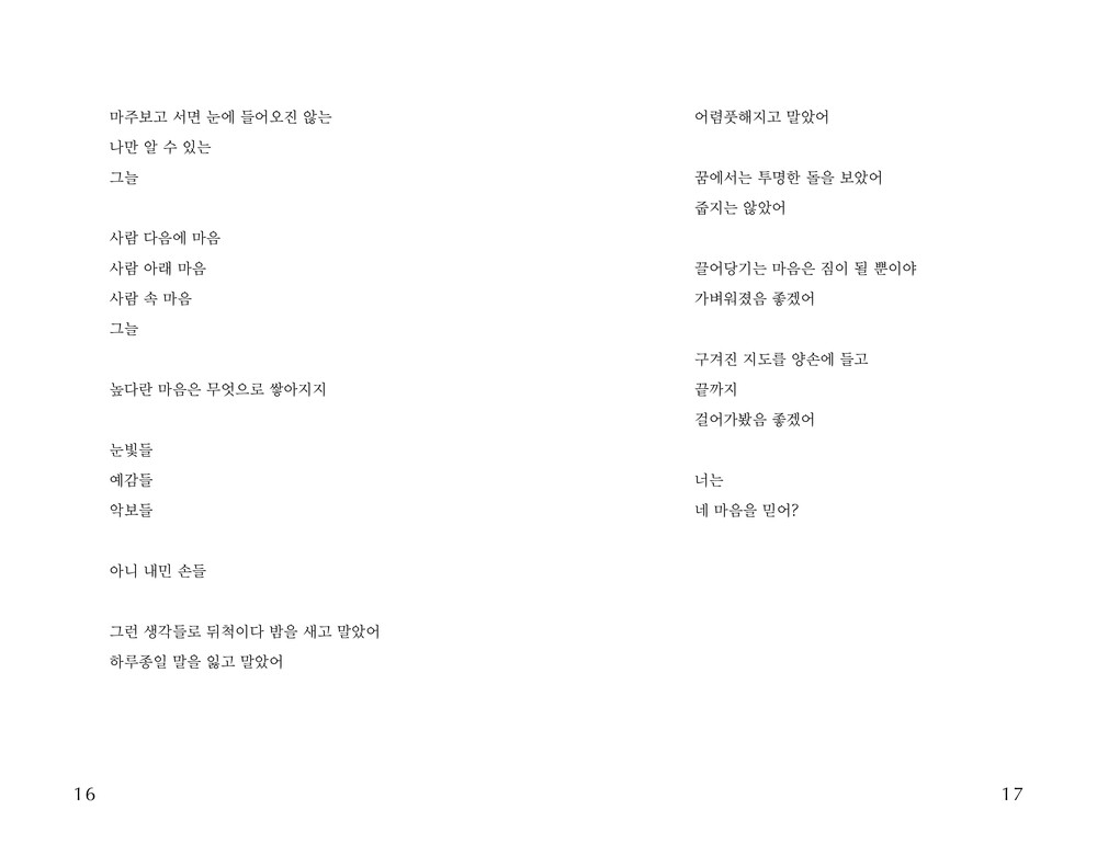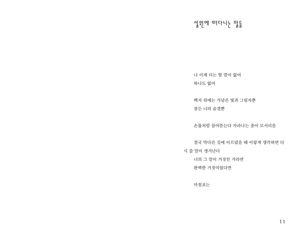 "얇게 저민 말들 그러나 딱히 악의가 없는 말들을/나는 잘 기억하고 있다/대부분의 말에는 원래 악의가 없어 차라리 진짜 마음이 담겨 있지 반쯤 풀린 눈으로 말해지는 그 말들이 나를 연못 속으로 밀어버릴지언정 난 그걸 기다리곤 해”