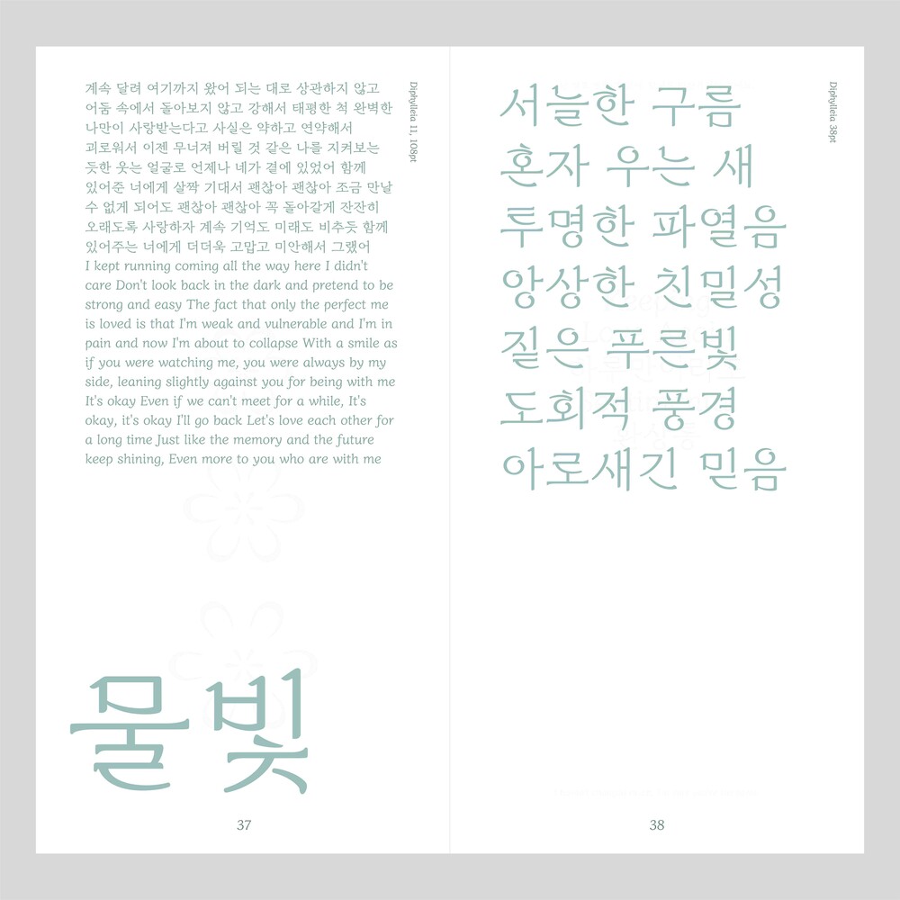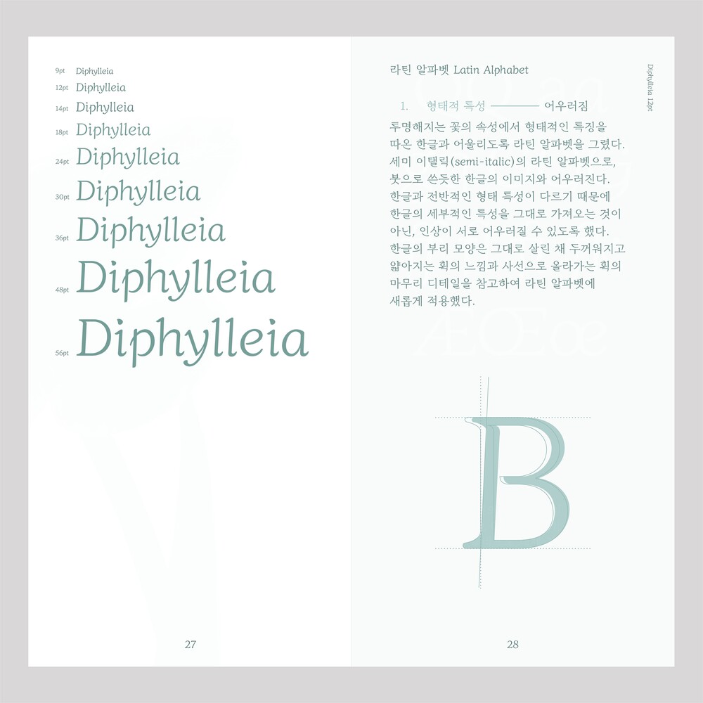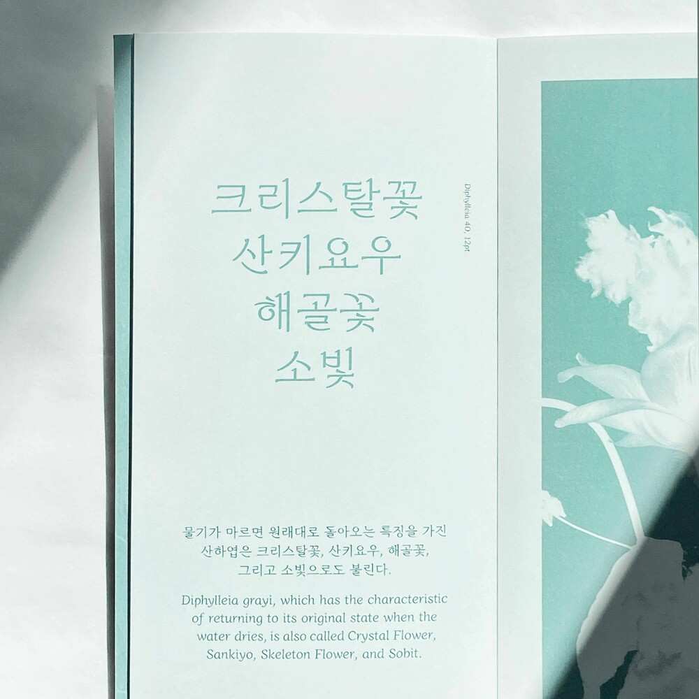 디보싱 처리되어 있는 표지와 함께, 내지에는 산하엽의 한글, 알파벳, 기호활자와 숫자에 대한 설명을 넣었습니다.