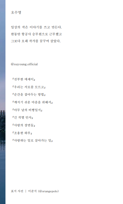 십년간 항공사 승무원으로 일했고 그보다 오래 작가를 꿈꿨다. 언뜻 다른 두 시절이 하나의 플롯처럼 이어지길 바라며 글을 썼고, 지금은 퇴사 후 독립출판사 고어라운드의 발행인이자 전업 작가로서의 새로운 삶을 살아간다. 저서로는 『사랑하는 일로 살아가는 일』 『조용한 하루』 『사랑의 장면들』 『우리는 서로를 모르고』 『깨지기 쉬운 마음을 위해서』 『순간을 잡아두는 방법』 『긴 작별 인사』 『아무 날의 비행일지』 『진부한 에세이』가 있다.