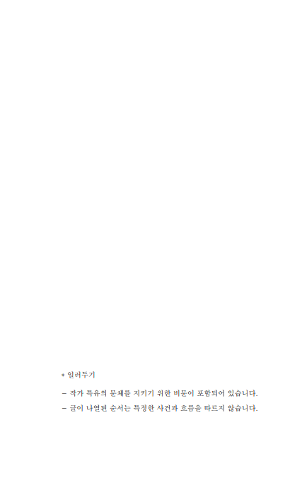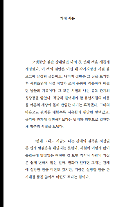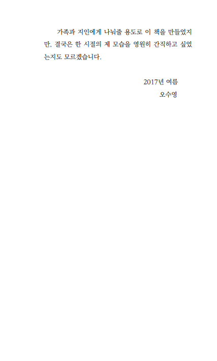 저자는 2017년부터 해마다 꾸준히 독립출판물을 출간하고 있다. 2024년 현재 저자의 아홉 번째 에세이 시리즈가 출간되었고, 다음으로 건너가기 전 한동안 절판되었던 데뷔작이자 첫 번째 산문집을 새롭게 개정했다. 세월이 흐른 만큼 문체와 생각도 지금과는 많이 다르지만, 저자의 글이 어떻게 시작되었는지 그 처음과 과정을 면밀히 살펴볼 수 있는 책이다. 평범한 사람의 인생에도 역사적 책임이 존재한다면 성실한 기록이 가장 정확하고 온전한 삶의 증명이 되어주길 바라며.