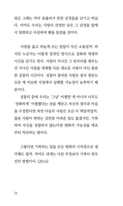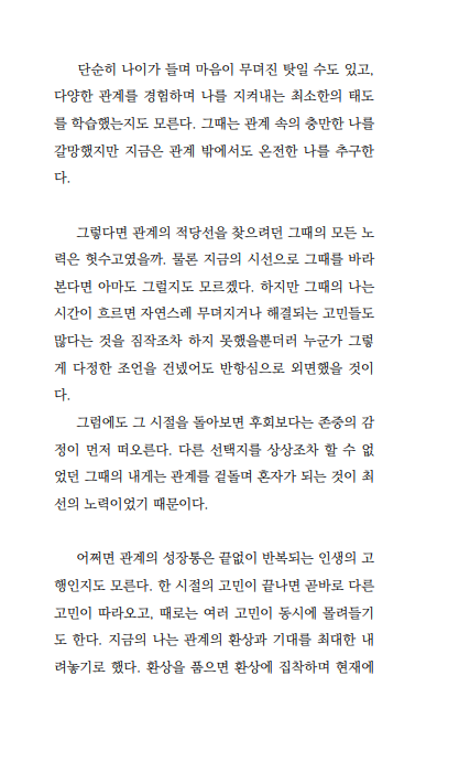 관계에 대한 고민과 방황으로 소란했던 나의 이십 대가 남겨준 건 외로움을 외면하는 것 또한 극복의 방법이 된다는 점이다. 섣불리 말이나 사람에게 기대는 것보다 단지 일상에 충실한 채 우리 곁의 외로움이 저절로 지나가길 내버려두는 것. 어쩌면 그 적당히 무심한 태도가 외로움을 제대로 길들이는 시작점이 될지도 모른다. P67