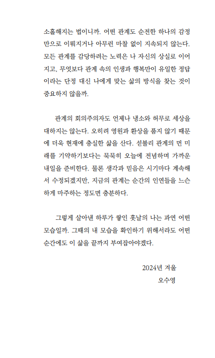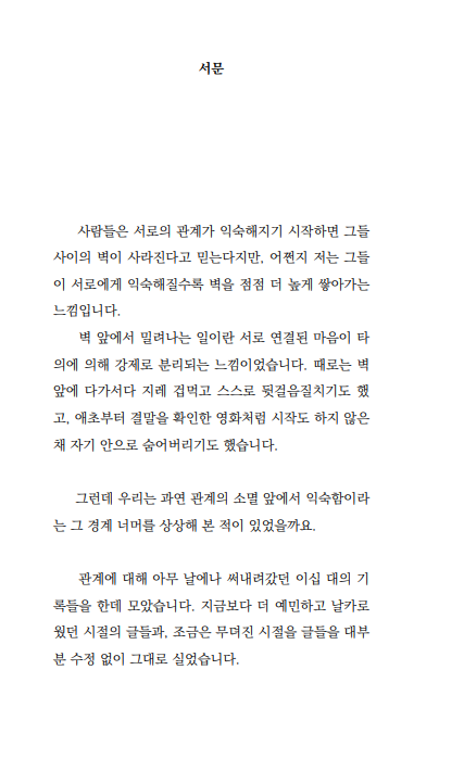 그럼에도 관계의 유한성 때문에 나는 아직 서로를 가로막는 벽이 솟아나지 않는 지금, 게다가 어느 날 그 벽이 솟아날 것임을 알면서도 다시, 기꺼이 정면으로 부딪쳐 보고 싶다. 그리하여 언젠가 내가 그 벽을 눕혀 당신에게 더 가까이 건너갈 수 있는 다리로 만들 기회가 찾아온다면, 그때는 그동안 가닿은 적 없던 새로운 세계의 문이 열릴 것이라고 믿는다.