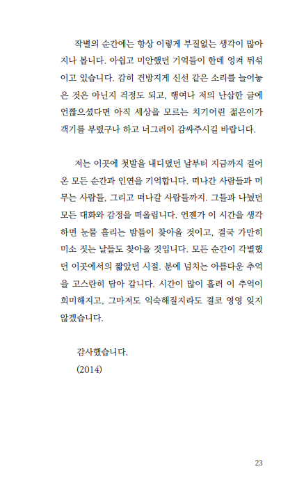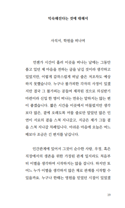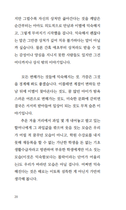 인간관계에 있어서 그것이 순수한 사랑, 우정, 혹은 직장에서의 생존을 위한 가장된 관계 일지라도 처음부터 이별을 생각하며 시작하지는 않을 겁니다. 하지만 또 어느 누가 이별을 생각하지 않은 채로 관계를 시작할 수 있을까요. 누구나 한때는 영원을 믿었던 시절이 있었겠지만 그럴수록 자신의 상처만 곪아간다는 것을 깨달은 순간부터는 아마도 의도적으로 만남과 이별에 익숙해지고, 그렇게 무뎌지기 시작했을 겁니다. 익숙해서 괜찮다는 말은 그만큼 상처가 깊어 치유 불가하다는 말이 아닐까 싶습니다.
