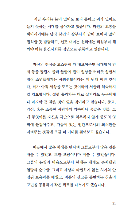 우리는 이제 더 많은 우리만의 입장을 갖게 됐다. 예전과는 다르게 지켜야만 하는 것들이 많아졌고, 무엇보다 겁도 많아져서 도무지 다른 사람의 입장을 생각하려 하지 않게 되었다. 속물이 되는 건 생각보다 간단하다. 자신이 추구하는 어떤 한 가지 가치에만 눈이 멀게 되면 다른 가치들은 전혀 볼 수 없는 장님이 된다. 그런 의미에서 우리는 그때나 지금이나 조금씩은 속물이지 않을까. 어린 시절에는 외톨이가 될지 모른다는 두려움이 있었다면, 지금은 이미 외톨이가 되었으니 지켜온 걸 잃을지도 모른다는 두려움이 생겼다.