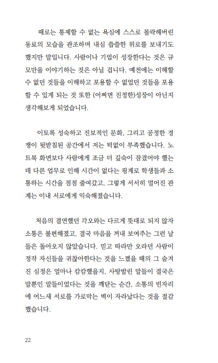 어른이 된다는 건 결국 모든 변화에 무뎌지는 일이라는 아픈 깨달음으로 이 책은 시작된다. 얼떨결에 사회인이 된 후 처음 맞닥뜨린 어른의 세상은 당혹스럽다. 만남과 이별, 개인과 집단, 열망과 타협, 노력과 실패 등등. 청춘의 기대와는 전혀 달랐던 사회 속 방황은 저자만의 유별난 통증은 아니었을 것이다. 그 시절의 통증을 기억하고 있다면, 혹은 지금 통증을 관통하고 있다면, 작가의 기록이 추억과 방황의 동료가 되어줄 것이라 믿는다. 성장통은 비단 청춘의 산물인 것만은 아닐 테니까.