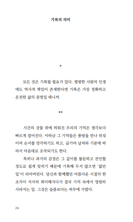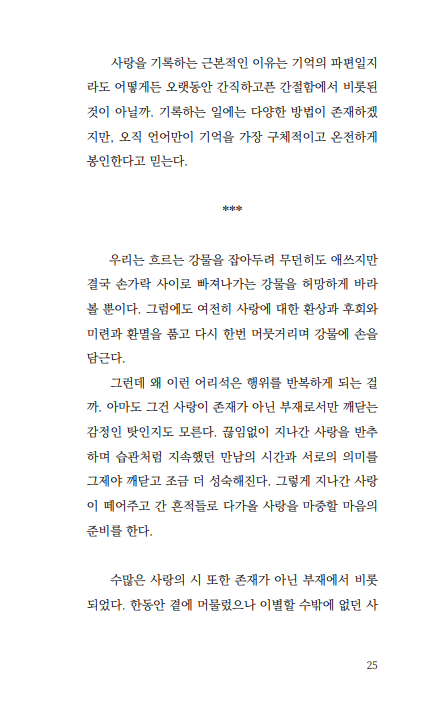 시간의 강물 위에 띄워진 우리의 기억은 생각보다 빠르게 멀어진다. 이따금 그 기억들은 풍랑을 만나 뒤섞이며 순서를 망각하기도 하고, 급기야 날씨와 기분에 따라서 마음대로 조작되기도 한다. 특히나 과거의 감정은 그 깊이를 불문하고 잔인할 정도로 쉽게 잊히기 때문에 기록해 두지 않으면 ‘없던 일’이 되어버린다. 당신과 함께했던 아름다운 시절의 한 조각이 서서히 희미해지다가 결국 기억 속에서 영원히 사라지는 일. 그것은 슬픔보다는 허무에 가깝다.