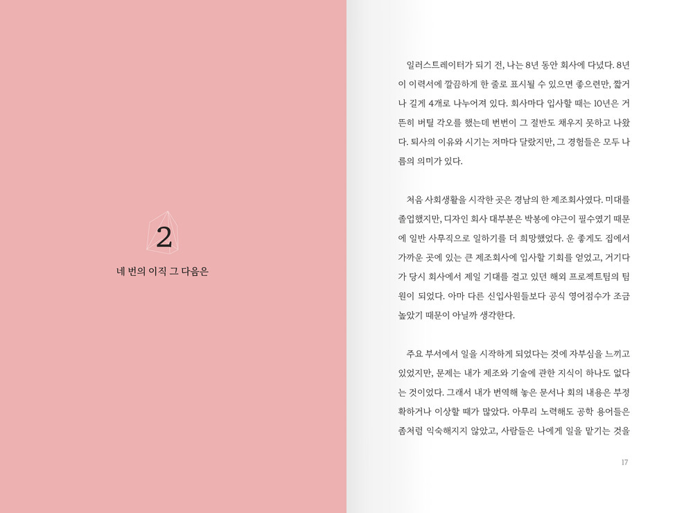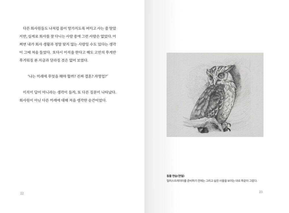 프리랜서 일러스트레이터의 삶은 불안하기 짝이 없지만, 그렇다고 회사에 다닐 때에도 불안하지 않은 것은 아니었다. 회사는 당장의 안정적인 수입은 보장해 줬지만, 실제 명예퇴직 압박을 받는 사람들을 보며 미래까지는 보장해 주진 않는다는 것을 알게 되었다.