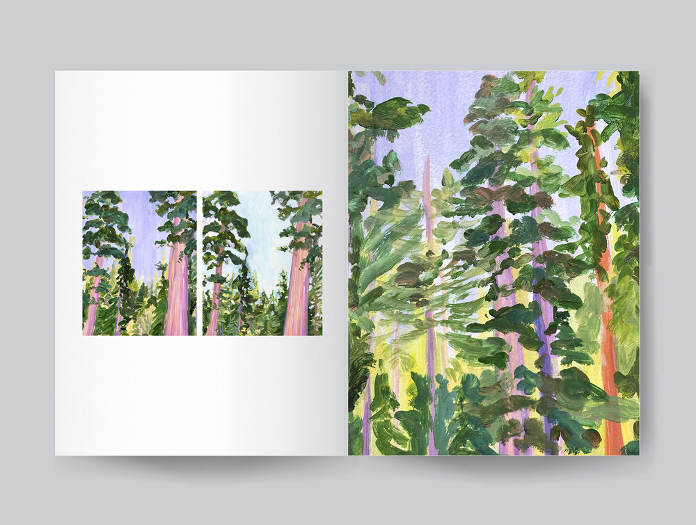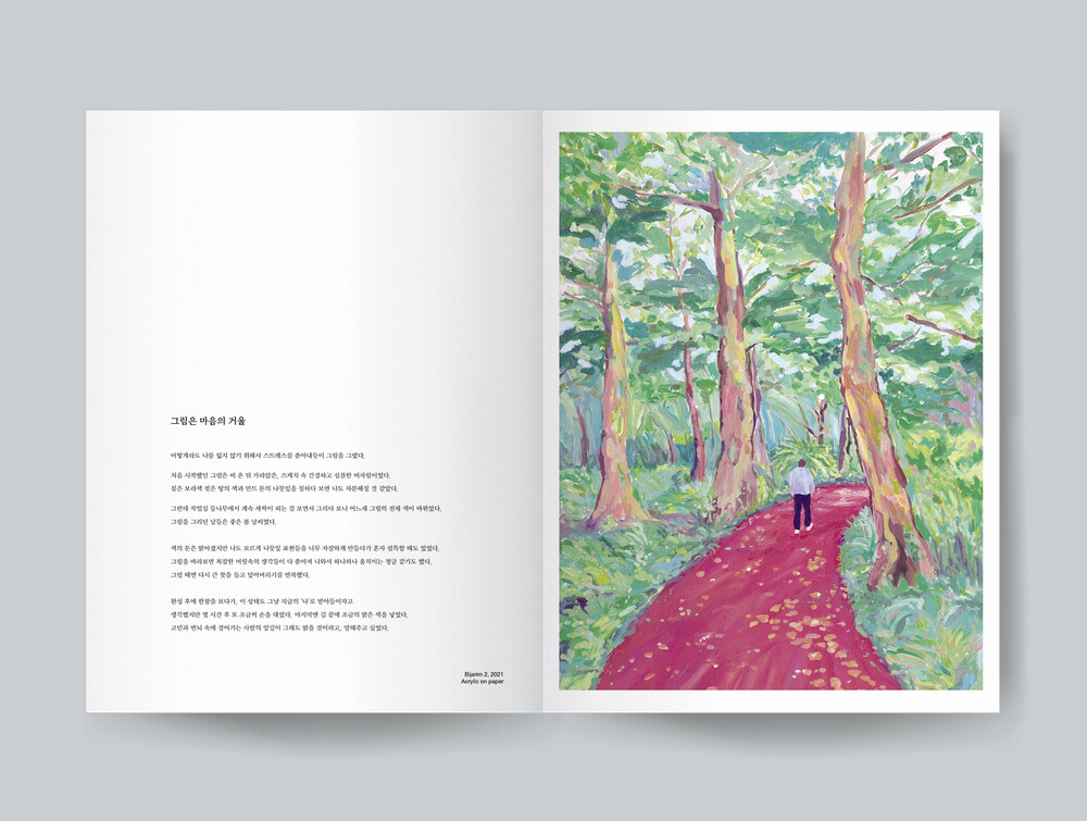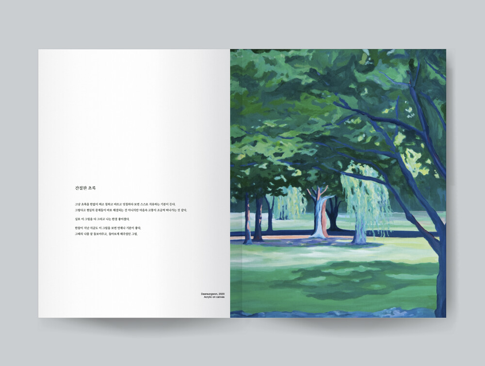 드로잉, 페인팅과 함께 나무를 그리는 과정과 완성 이후에 그림을 보며 작업에 대한 의미를 찾고 스스로를 돌아보는 과정에 대한 짧은 일기 형식의 글이 함께 수록되어 있습니다.