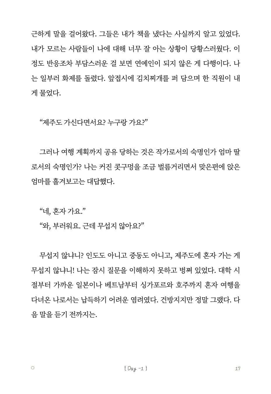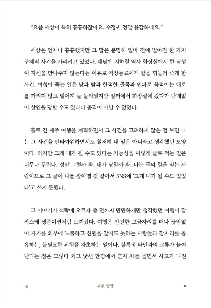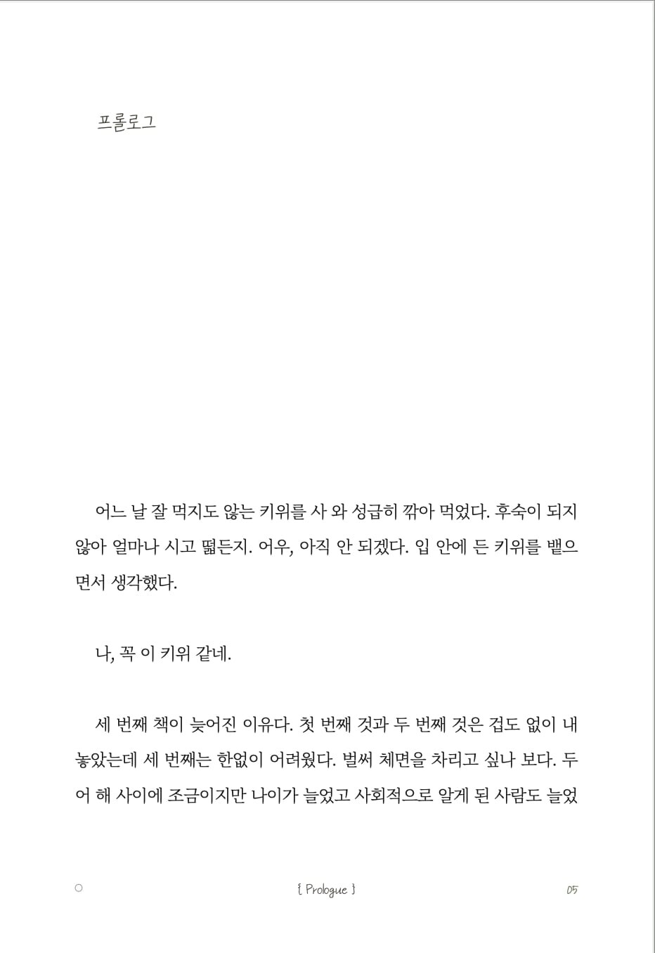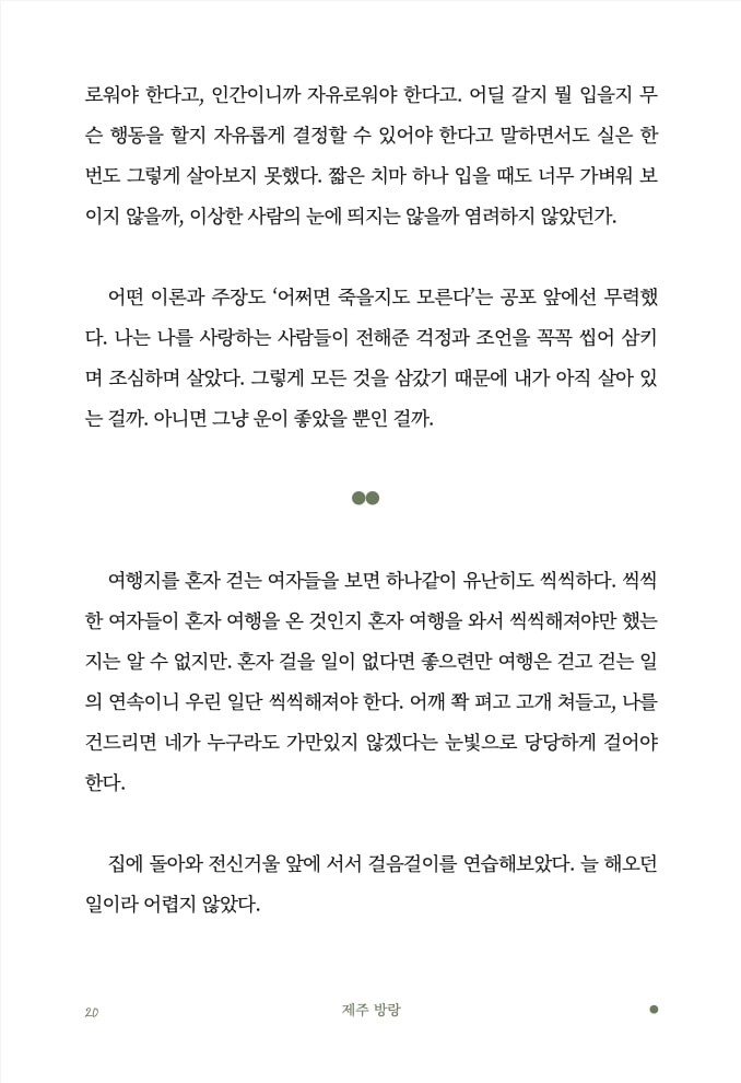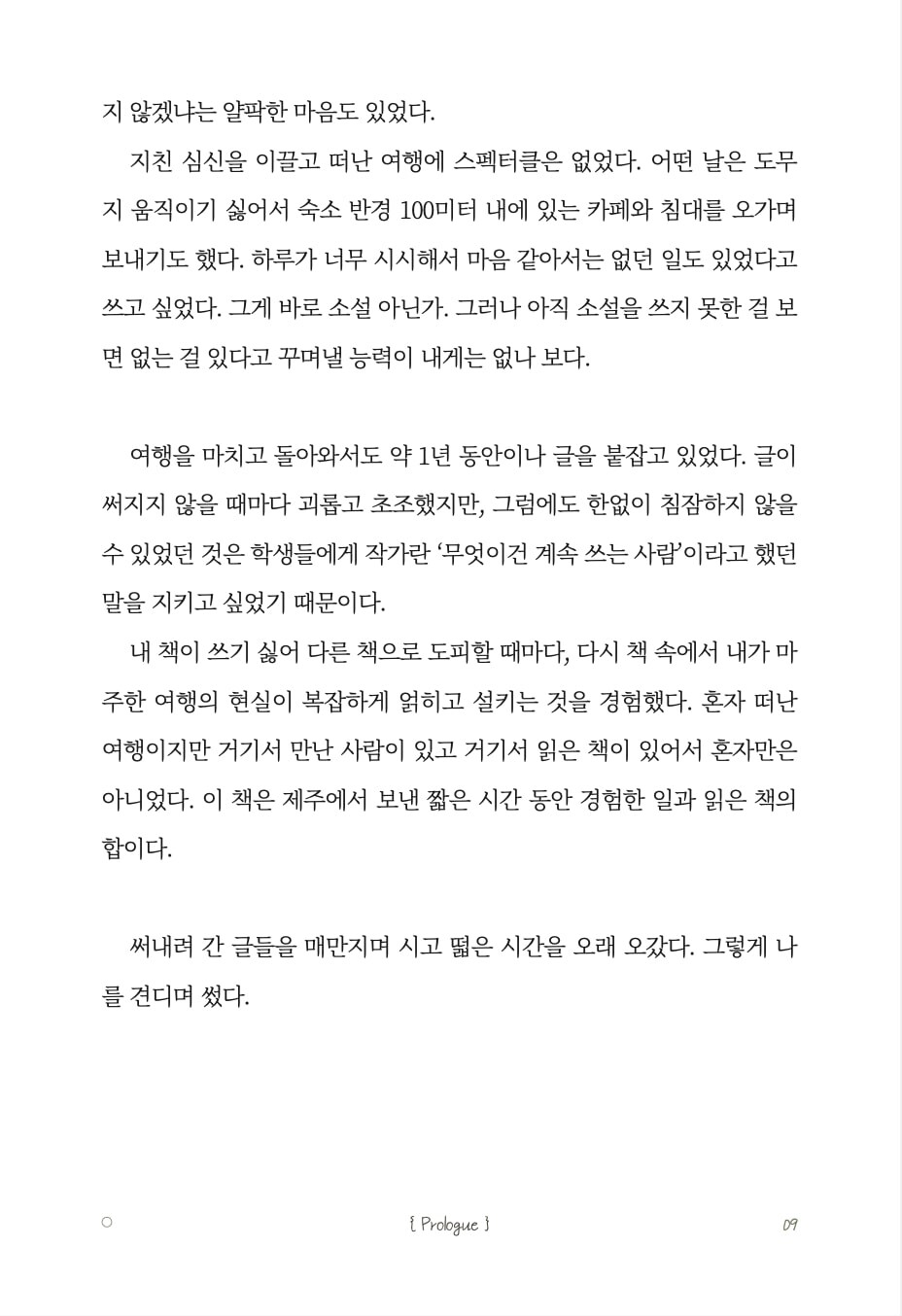 p. 190 나에 대해 생각하는 시간이 많아질수록 좋은 것과 싫은 것이 점점 분명해진다. 고정된 자아란 존재하지 않는다고 믿지만, 언젠가는 변할지라도 현재의 내가 무엇을 욕망하는 인간인지를 아는 일이 내게는 너무 중요했다. 그래야 삶의 방향과 그에 임하는 태도를 정할 수 있기 때문에. “남들이 하고 사는 일들은 우리도 다 하고 살겠다는 다짐(박준, 「선잠」)”을 품고서 남들처럼 살지 않는 것은 말이 안 되고, 남들만큼 살겠다는 생각도 없으면서 남들처럼 사는 것은 너무 불행하니까.