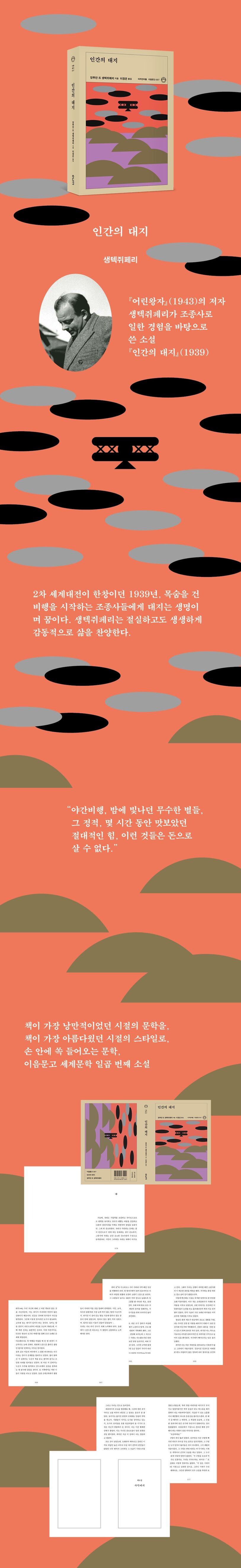 인간의 대지는 『어린왕자』의 저자 생텍쥐페리가 비행기 조종사 시절의 경험을 바탕으로 써내려간 소설이다. 목숨을 건 비행에서 대지는 따뜻하게 품어주는 은신처가 되기도 때로는 생명을 담보로 위협을 내리치는 무서운 존재가 되기도 한다. 폭풍우와 뾰족하고 가파른 산, 변덕이 심한 드넓은 바다, 끝없는 사막... 대자연 앞에서 인간의 본질은 극명하게 드러난다. 비행사는 생각에 잠긴다. 평화로운 밤에서 비가 올 것을 예감하기도 하고 휘몰아치는 폭풍우에서 명멸하는 달빛을 찾아낸다. 물 한모금 마실 수 없는 사막에서 정치적 이념은 중요하지 않다. 사람과 사람 그리고 자연이 있을 뿐이다.