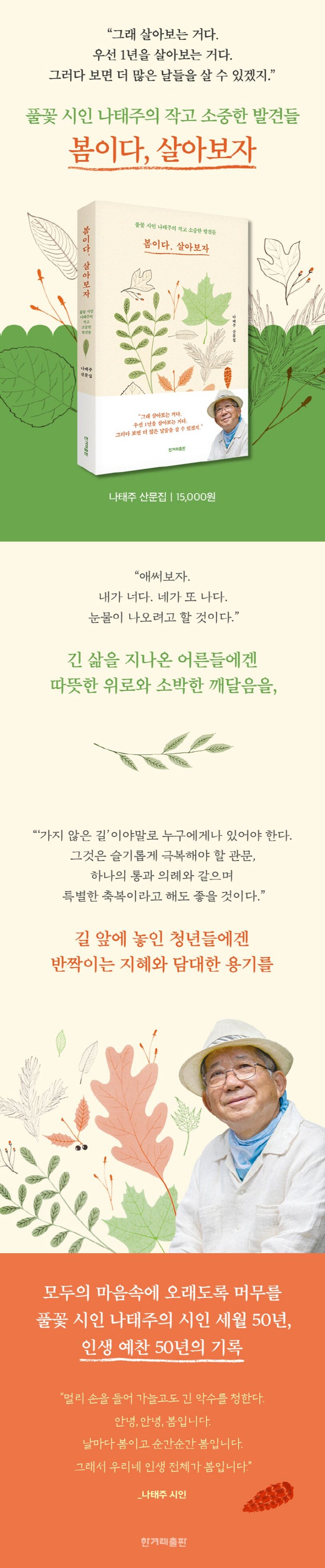 시인을 꿈꾸던 어린 소년에서, 수십 년간 성실히 교단에 서며 아이들과 꽃과 시를 가꿔온 초등학교 선생님, 우리 곁의 소박한 시인이 되기까지. 동네 어귀, 들꽃밭, 작은 병상, 어디에서든 시 쓰기를 놓지 않았던 그의 인생은 ‘작은 것들에 대한 예찬’이었다. 《봄이다, 살아보자》는 나태주 시인이 자신의 삶을 회고하며 오랫동안 차근히 집필해온 산문집으로, 일상에서 만난 놀라운 생명력과 회복력에 대한 그의 섬세한 마음이 담겨 있다.