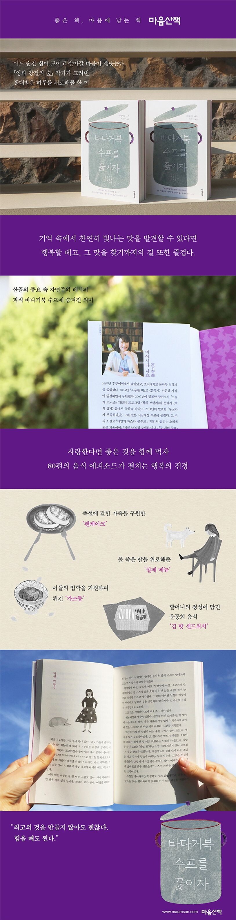 『바다거북 수프를 끓이자』에는 김, 찐빵, 만두 같은 평범한 먹거리부터 아펠쿠헨, 애플파이 같은 손이 많이 가는 디저트까지 다양한 음식과 그에 얽힌 일화가 펼쳐지지만, 그의 글은 단순히 맛깔난 묘사에 그치지 않는다. “매일매일 먹는 밥이 너를 살린단다”(『태양의 파스타, 콩수프』의 한 구절)라는 말처럼 작가가 그려낸 식사 장면은 우리의 홀대받은 하루를 뭉근하게 위로하기 충분하다. 공부에, 일에, 육아에 탈탈 털린 하루, 편의점 도시락으로 한 끼를 때웠다면, 미야시타가 맛의 언어로 차려낸 가정식을 권한다. 『바다거북 수프를 끓이자』 속 음식을 상상하고 우리의 추억을 겹쳐보며 오늘의 나쁜 일은 다 삼켜버리자.