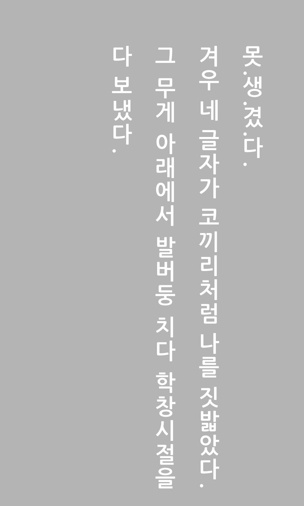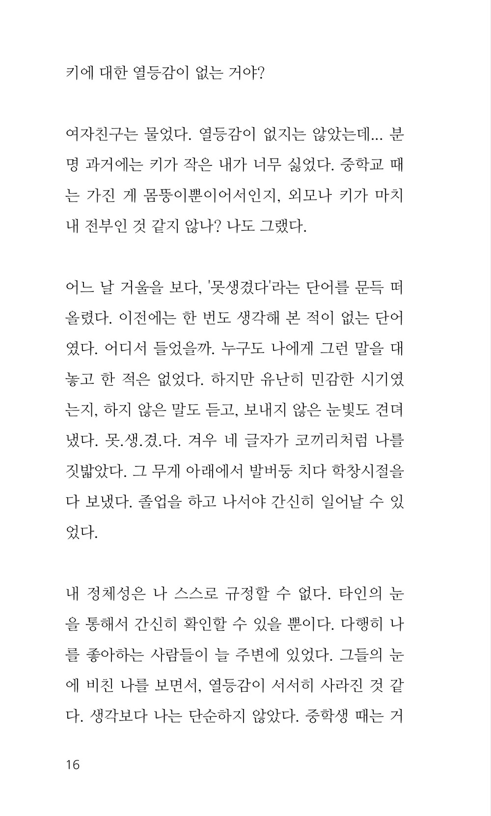 그 무게 아래에서 발버둥 치다 학창시절을 다 보냈다. 졸업을 하고 나서야 간신히 일어날 수 있었다. 16