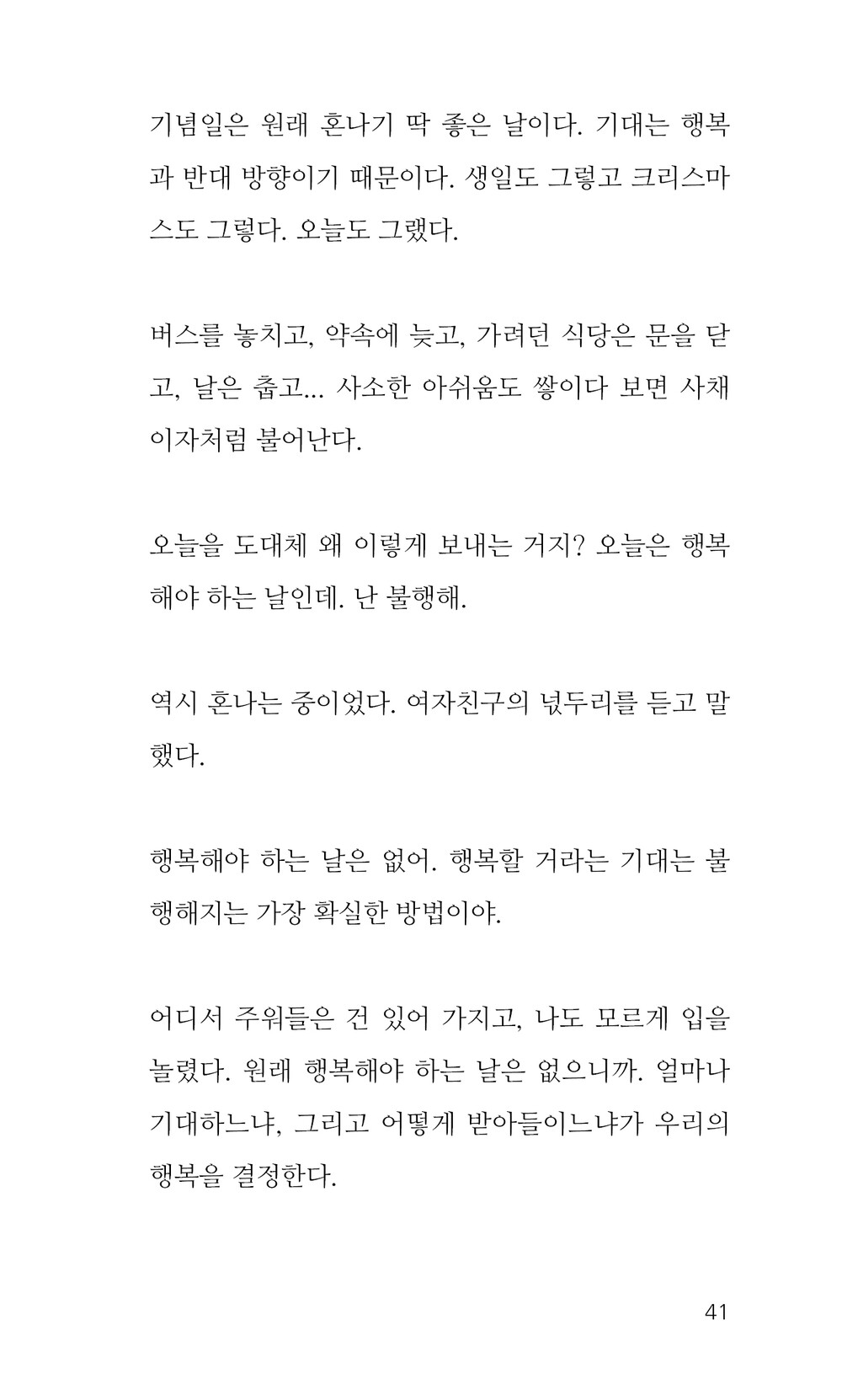 행복해야 하는 날은 없어. 행복할 거라는 기대는 불행해지는 가장 확실한 방법이야.