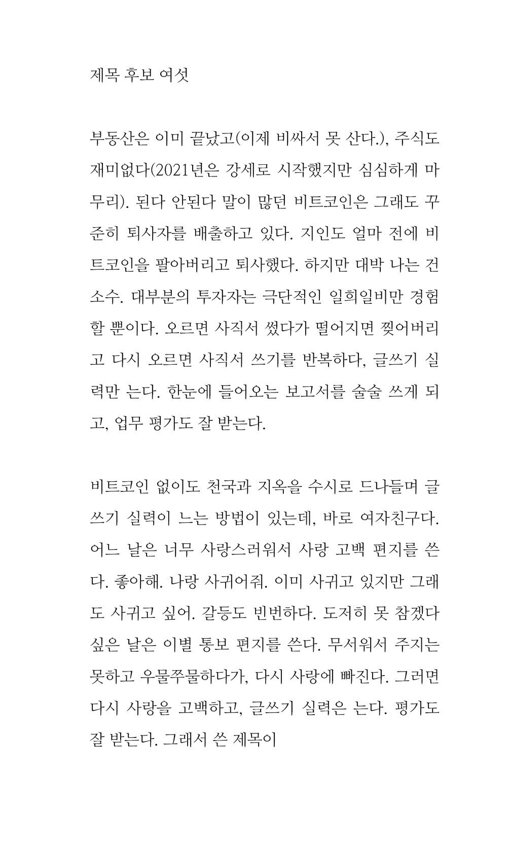 비트코인 없이도 천국과 지옥을 수시로 드나들며 글쓰기 실력이 느는 방법이 있는데, 바로 여자친구다.