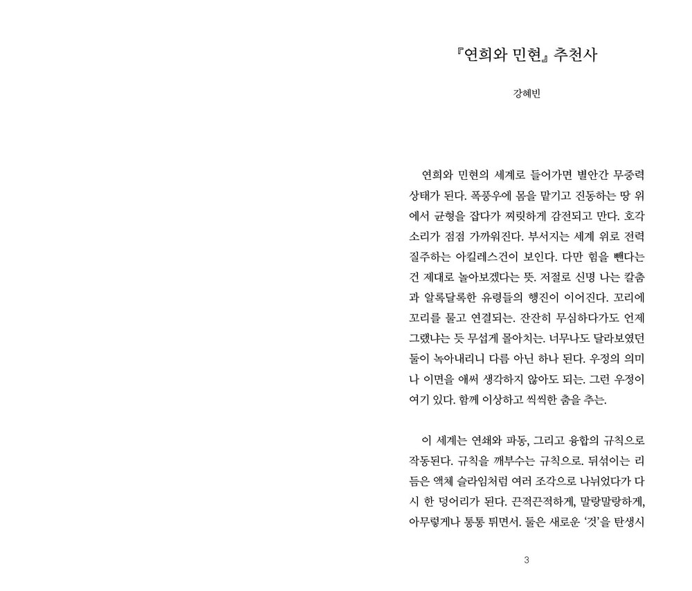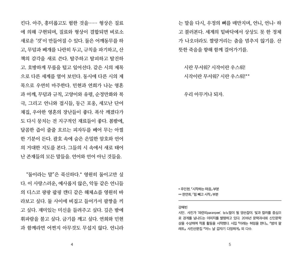 “둘이라는 말”은 푹신하다.* 영원히 둘이고만 싶다. 이 사랑스러운, 예사롭지 않은, 악동 같은 언니들의 디스코 팡팡 팝핑 캔디 같은 해체쇼를 영원히 바라보고 싶다. 둘 사이에 비집고 들어가서 팔짱을 끼고 싶다. 재미있는 미신을 들려주고 싶다. 깊은 밤에 휘파람을 불고 싶다. 금기를 깨고 싶다. 연희와 민현과 함께라면 어쩐지 아무 것도 무섭지 않다. 언니라는 말을 다시, 우정의 뼈를 매만지며, 언니, 언니- 하고 불러본다. 세계의 밑바닥에서 상상도 못한 정체가 나오더라도 짤랑거리는 춤을 멈추지 않기를. 산뜻한 죽음을 향해 함께 걸어가기를.
