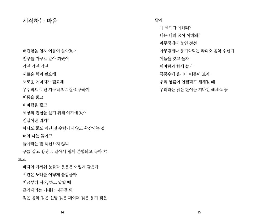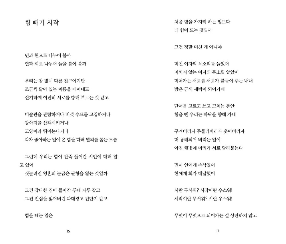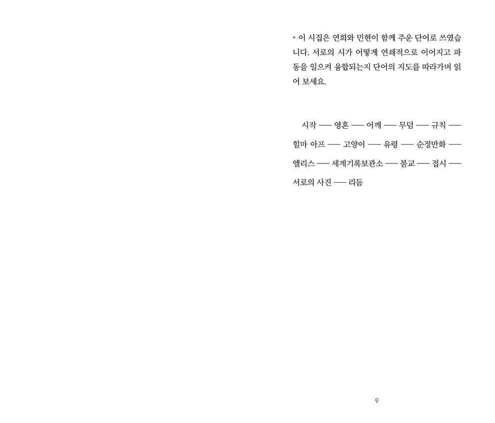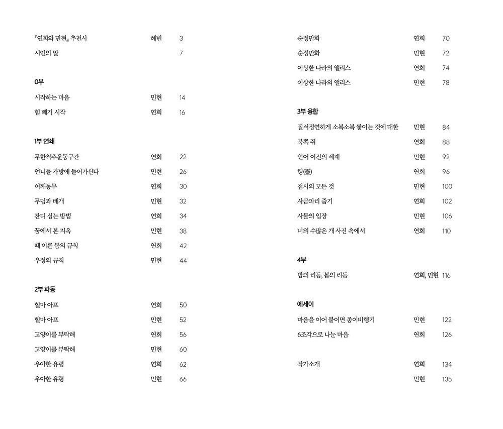 이 세계는 연쇄와 파동, 그리고 융합의 규칙으로 작동된다. 규칙을 깨부수는 규칙으로. 뒤섞이는 리듬은 액체 슬라임처럼 여러 조각으로 나뉘었다가 다시 한 덩어리가 된다. 끈적끈적하게, 말랑말랑하게, 아무렇게나 통통 튀면서. 둘은 새로운 ‘것’을 탄생시킨다. 아주, 흥미롭고도 험한 것을…… 형상은 질료에 의해 구현되며, 질료와 형상이 결합되면 비로소 새로운 ‘것’이 만들어질 수 있다. 둘은 어깨동무를 하고 무덤과 베개를 나란히 두고 규칙을 파기하고 산책의 감각을 새로 쓴다. 탈주하고 탈피하고 탈진하고. 호방하게 무릎을 털고 일어선다. 같은 시의 제목으로 다른 세계를 열어 보인다. 동시에 다른 시의 제목으로 우연히 마주한다. 민현과 연희가 나눈 영혼과 어깨, 무덤과 규칙, 고양이와 유령, 순정만화와 북극, 그리고 언니와 접시들, 둥근 포옹, 세모난 단어 채집, 우아한 영혼의 장난들이 좋다. 폭삭 깨졌다가도 다시 뭉치는 전 지구적인 재료들이 좋다. 봄밤에, 달콤한 즙이 줄줄 흐르는 피자두를 베어 무는 아찔한 기분이 든다. 괄호 속에 숨은 은밀한 암호와 언어의 거대한 지도를 본다. 그들의 시 속에서 새로 태어난 존재들의 모든 말들을. 언어와 언어 아닌 것들을.