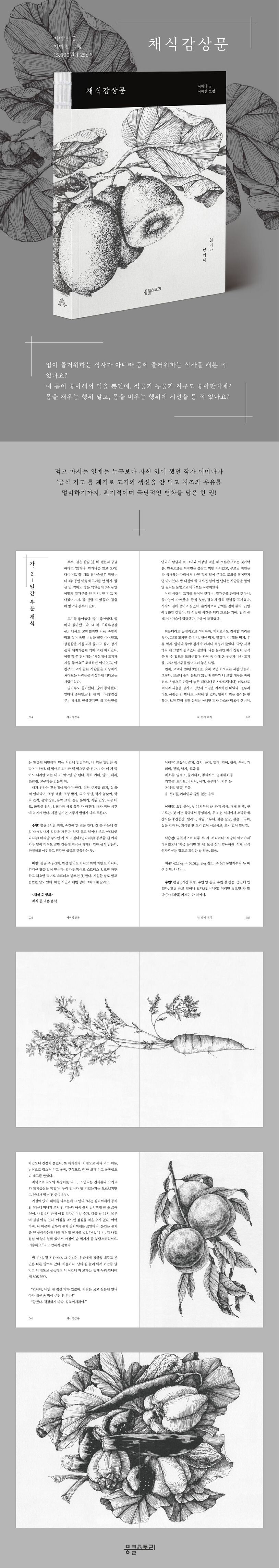《식후감상문》으로 많은 이들에게 ‘먹는 행복’을 전파한 작가 이미나가 차기작 《채식감상문》으로 돌아왔다. 그는 육류와 디저트류를 먹고 갖가지 음료를 마시는 행위를 자랑한 《식후감상문》 집필 당시 이미 채식 중이었음을 토로하며 ‘면목이 없다’는 첫 문장을 시작으로 그만의 유쾌한 문체에 채식 기록을 담아 독자들에게 전한다. 먹고 마시는 일에는 누구보다 자신 있어 했던 작가가 ‘금식 기도’를 계기로 고기와 생선을 안 먹고 치즈와 우유를 멀리하기까지, 획기적이며 극단적인 변화를 담았다.