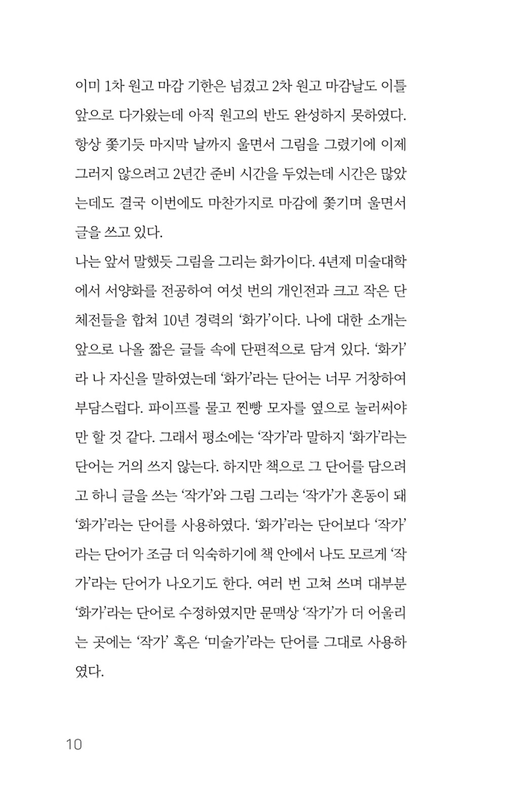 4년제 미술대학에서 서양화를 전공하여 여섯 번의 개인전과 크고 작은 단체전들을 합쳐 10년 경력의 '화가'이다.