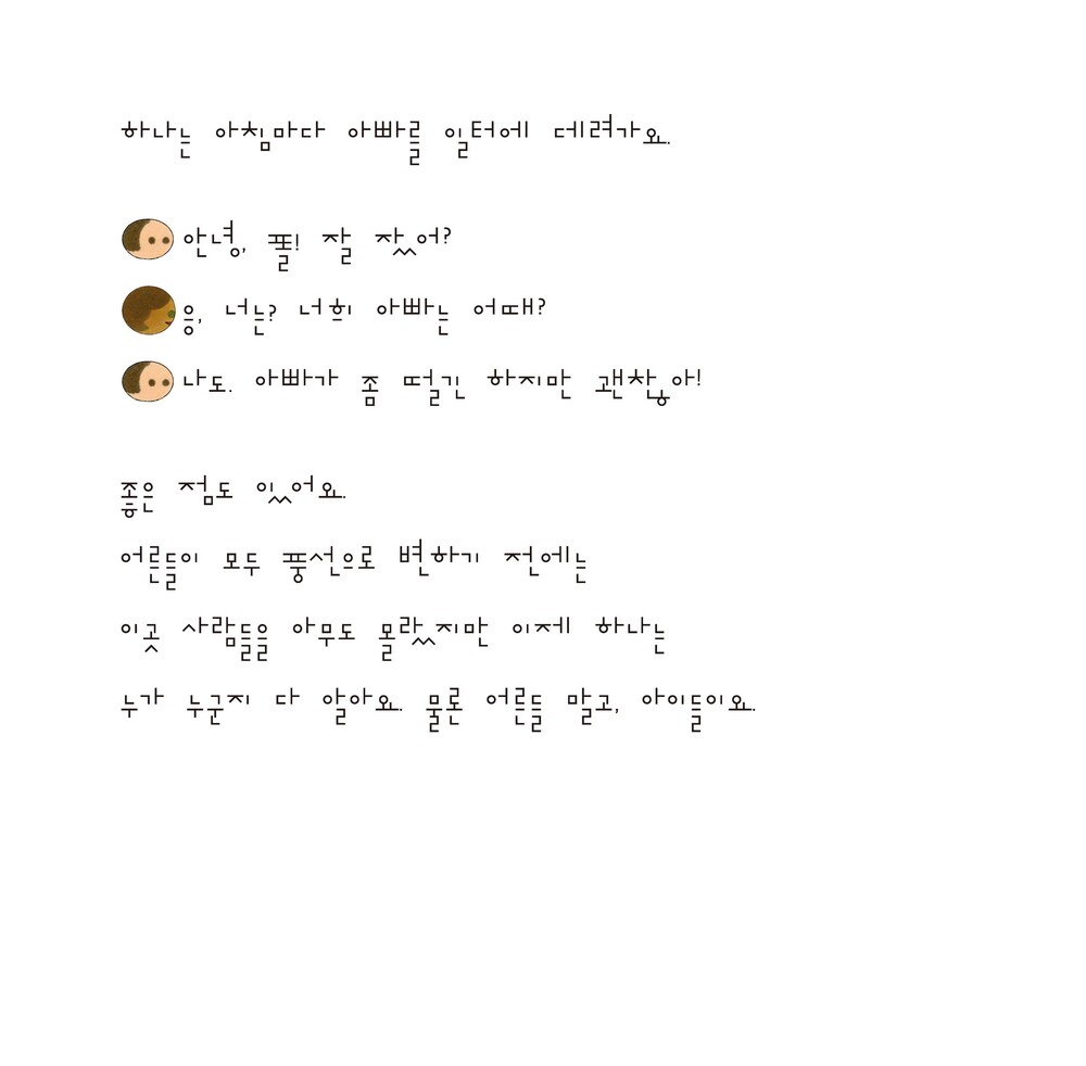 한국어판에서는 조형미가 뛰어난 그림과 어우러지도록 기하학적 뉘앙스가 강한 탈네모꼴 글자체를 사용하였습니다. 만화와 일러스트레이션 작업을 통해 다국어, 다국인이 함께하는 동시대 생활인의 감각과 다양성의 가치를