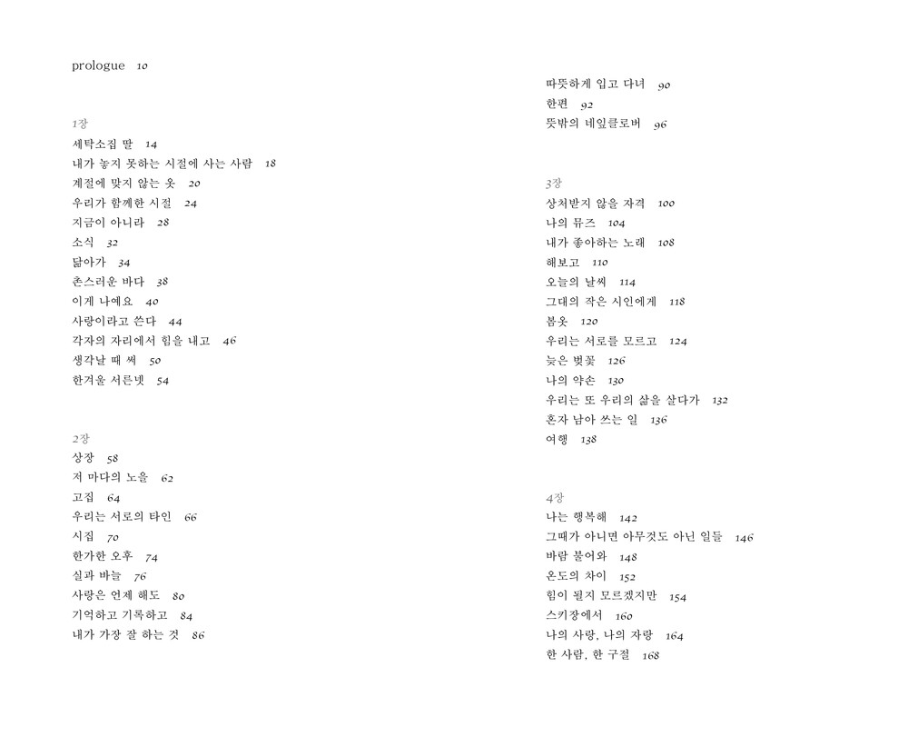 나는 행복해 142 / 그때가 아니면 아무것도 아닌 일들 146 / 바람 불어와 148 / 온도의 차이 152 / 힘이 될지 모르겠지만 154 / 스키장에서 160 / 나의 사랑, 나의 자랑 164 / 한 사람,한 구절 168 / 좋은 사람 172 / 연장선 176 / 막다른 이별 앞에 180 / 시인에게 뮤즈가 없다면 184 / 환절기 186