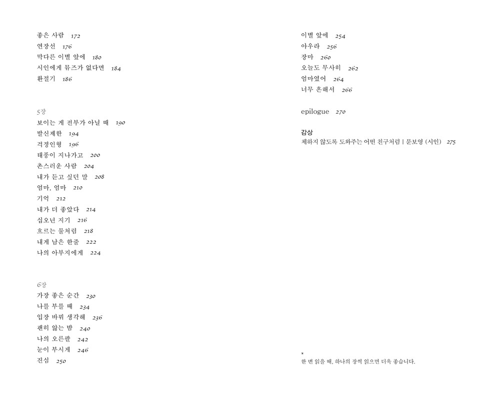 가장 좋은 순간 230 / 나를 부를 때 234 / 입장 바꿔 생각해 236 / 괜히 앓는 밤 240 / 나의 오른팔 242 / 눈이 부시게 246 / 진심 250 / 이별 앞에 254 / 아우라 256 / 장마 260 / 오늘도 무사히 262 / 엄마였어 264 / 너무 흔해서 266