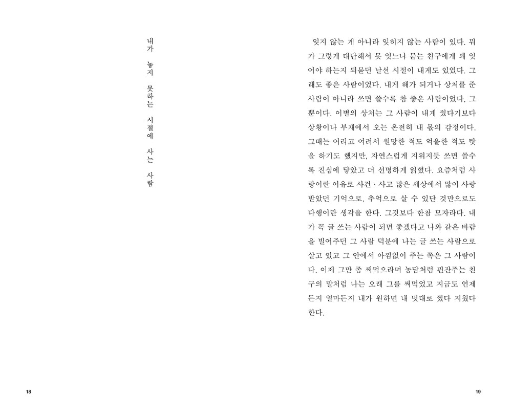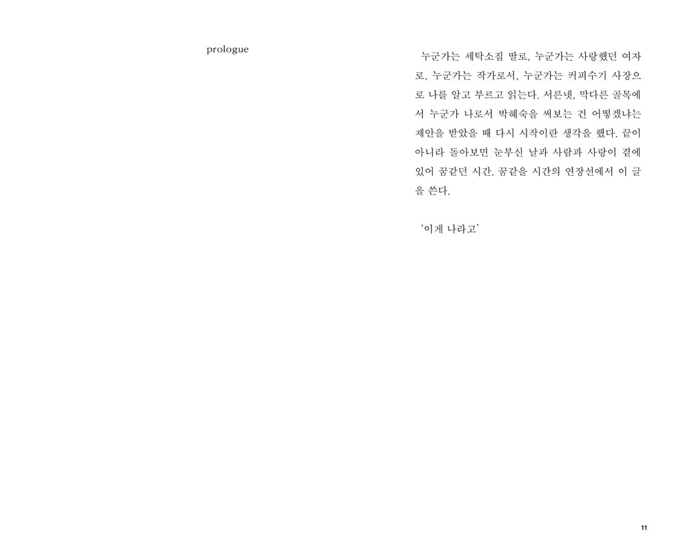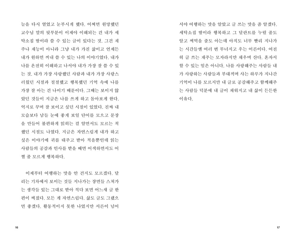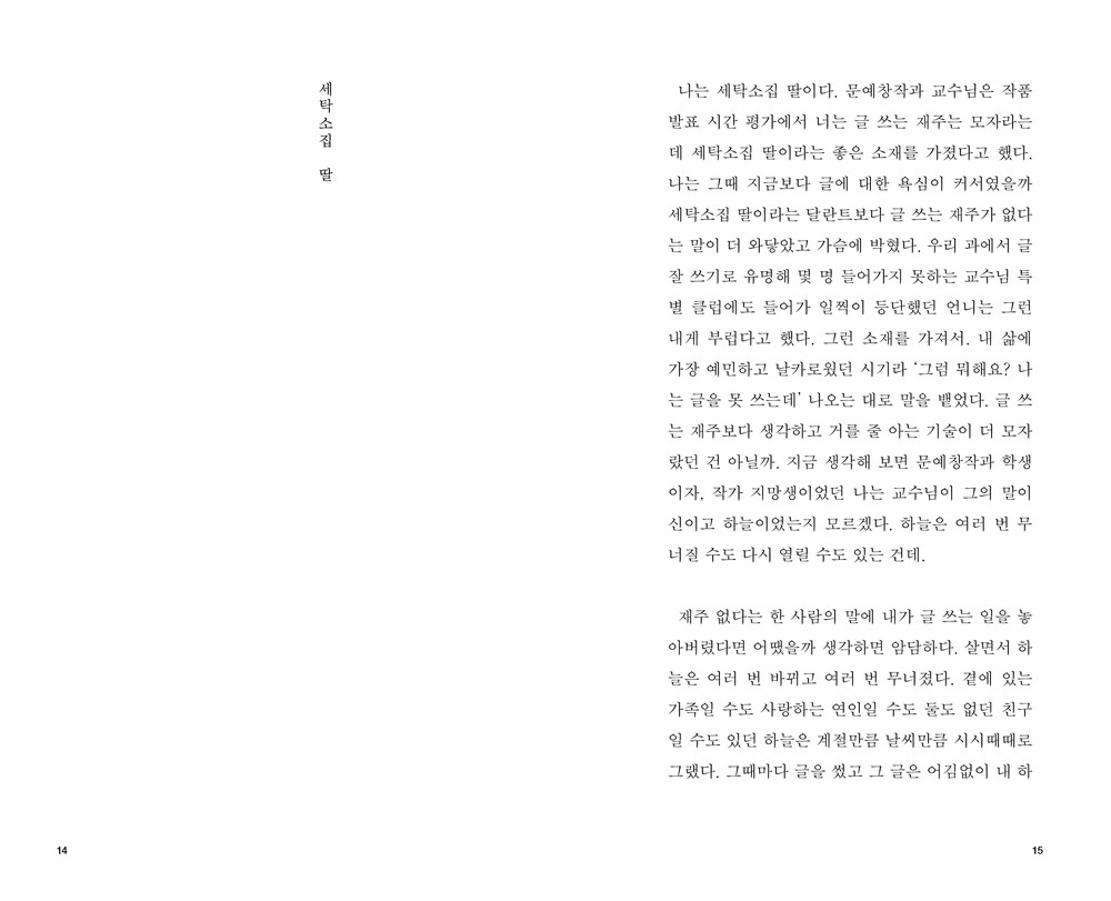 세탁소집 딸 14 / 내가 놓지 못하는 시절에 사는 사람 18 / 계절에 맞지 않는 옷 20 / 우리가 함께한 시절 24 / 지금이 아니라 28 / 소식 32 / 닮아가 34 / 촌스러운 바다 38 / 이게 나예요 40 / 사랑이라고 쓴다 44 / 각자의 자리에서 힘을 내고 46 / 생각날 때 써 50 / 한겨울 서른넷 54
