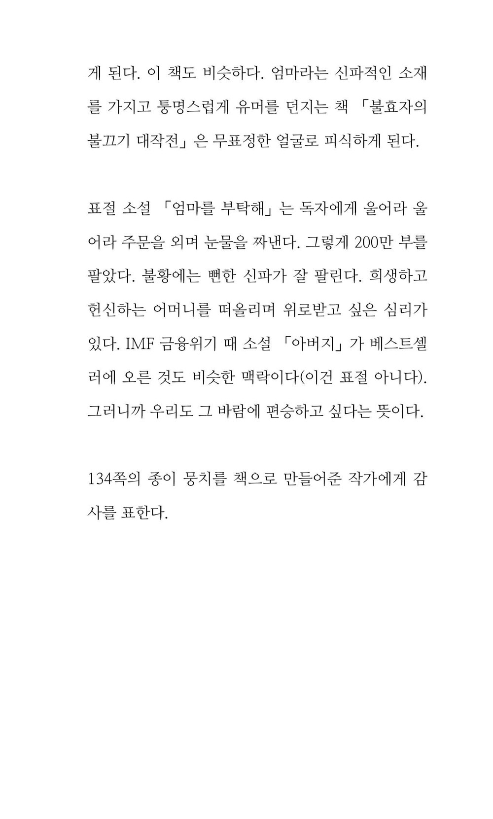 엄마라는 신파적인 소재를 가지고 퉁명스럽게 유머를 던지는 책