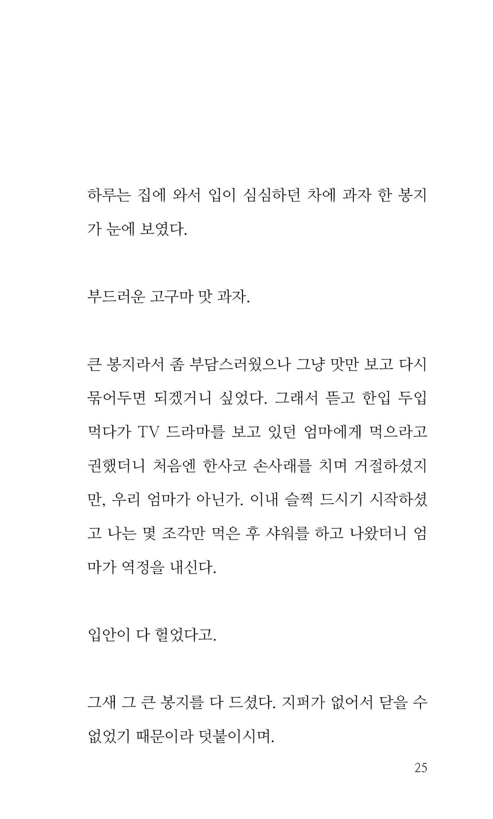 입안이 다 헐었다고. 그새 그 큰 봉지를 다 드셨다. 지퍼가 없어서 닫을 수 없었기 때문이라 덧붙이시며. 11
