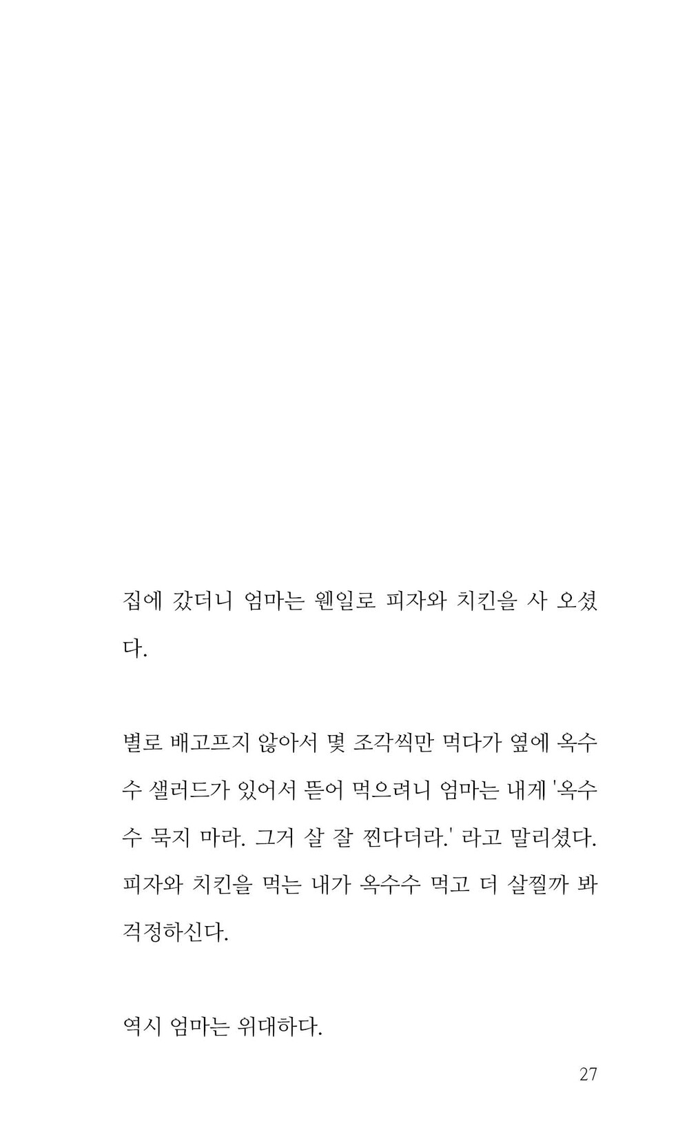 별로 배고프지 않아서 몇 조각씩만 먹다가 옆에 옥수수 샐러드가 있어서 뜯어 먹으려니 엄마는 내게 '옥수수 묵지 마라. 그거 살 잘 찐다더라.' 라고 말리셨다. 피자와 치킨을 먹는 내가 옥수수 먹고 더 살찔까 봐 걱정하신다.