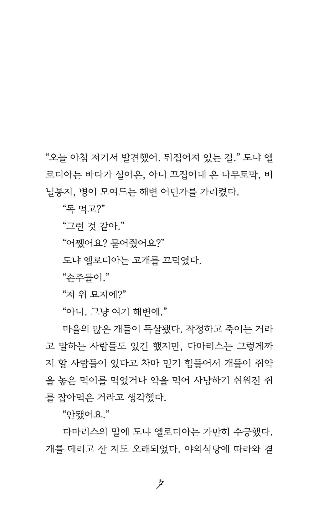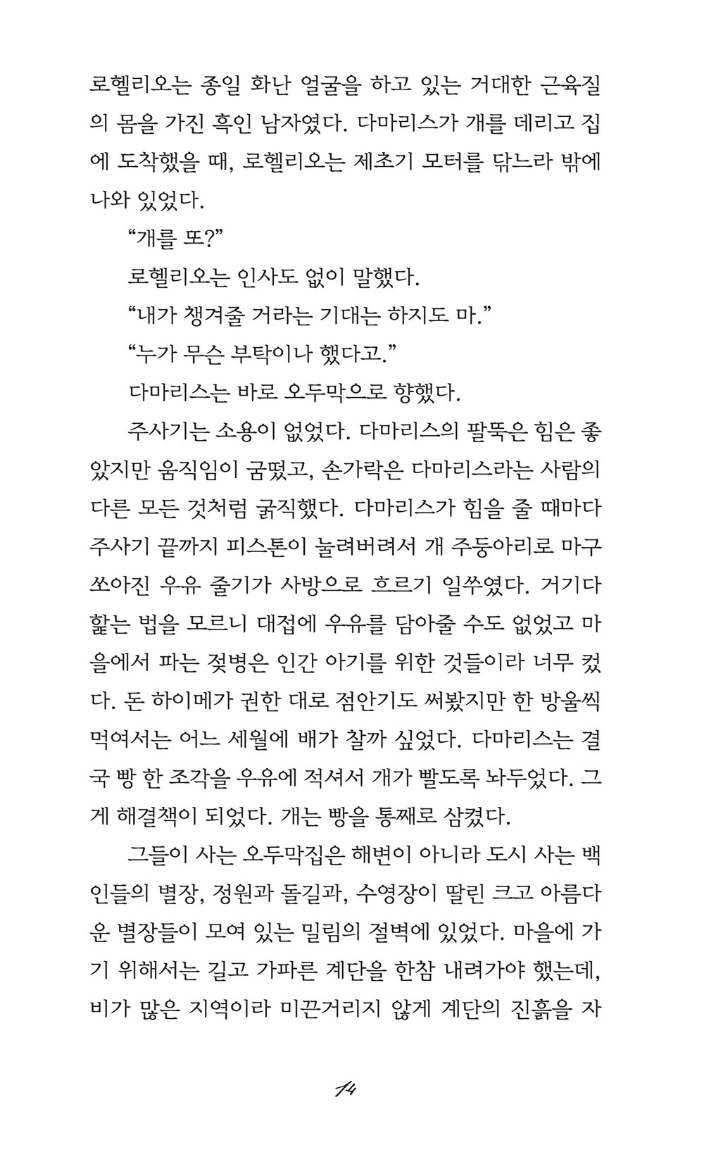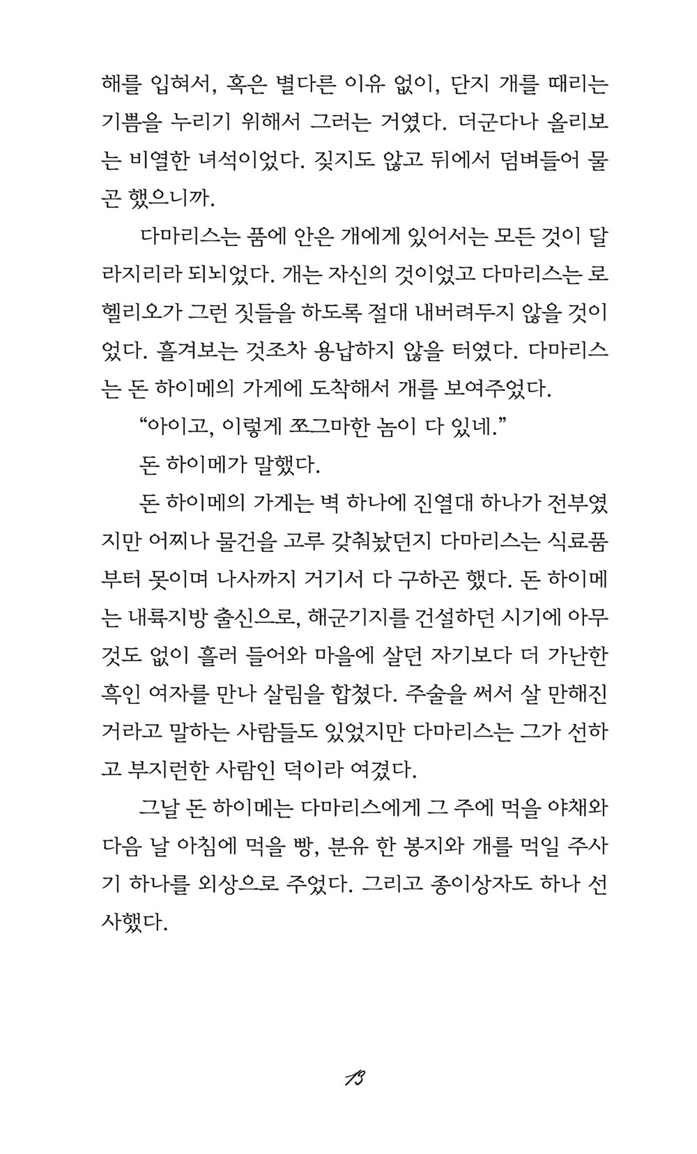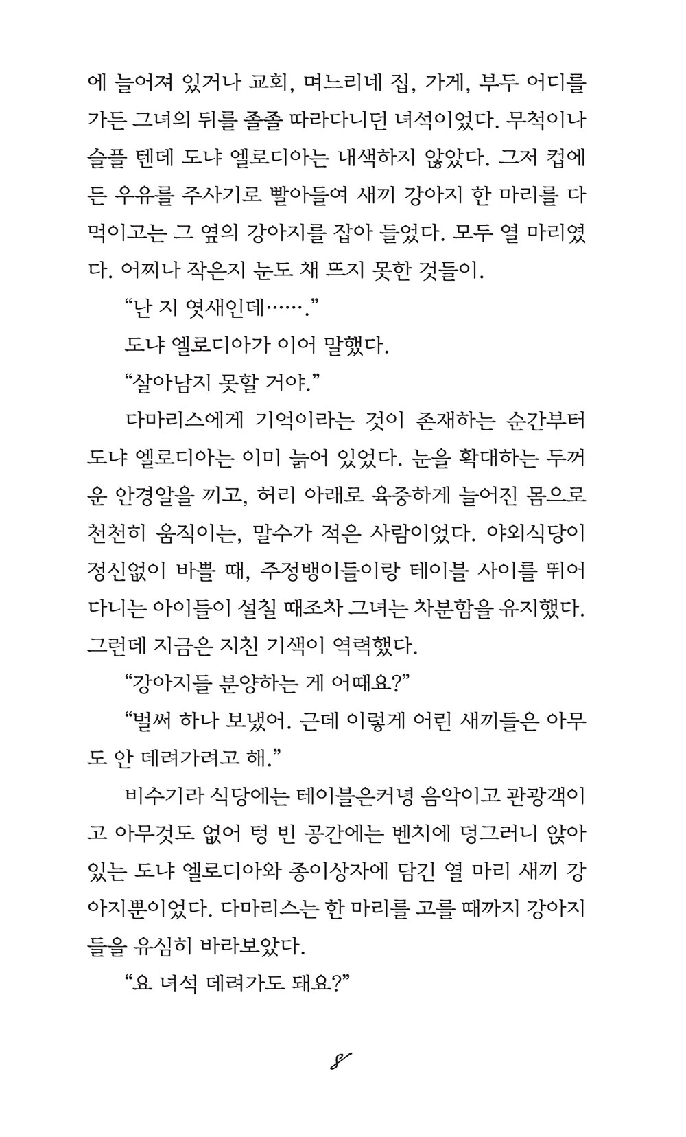 히메나는 개를 돌보지 않았고, 개는 다시 새끼를 뱄고, 계속해서 도망갔을 것이고 아무리 다마리스가 많이 되돌려놓는다 해도 상관없이 자기 집이라고 생각하는 곳으로 돌아왔을 것이었다. 키오스코에서 결국 새끼를 낳았을 것이고 또다시 다마리스는 강아지들을 책임져야만 했을 것이다. 개는 이미 나쁜 엄마임이 입증되었으니, 개들을 또 버려두었을 것이고, 이번에는 몇 마리나 태어났을지 누가 알 것이며, 그중에 아무도 원하지 않을 암컷은 도대체 몇 마리였을 것인가. 그렇다면 이번에는 정말로 다마리스가 새끼들을 바다에 던지게 될 것이며, 그건 죽이는 것과 매한가지고, 한 마리로 다 해결될 일을, 여러 마리를 죽이게 되는 셈이니까. — 109-110 pp