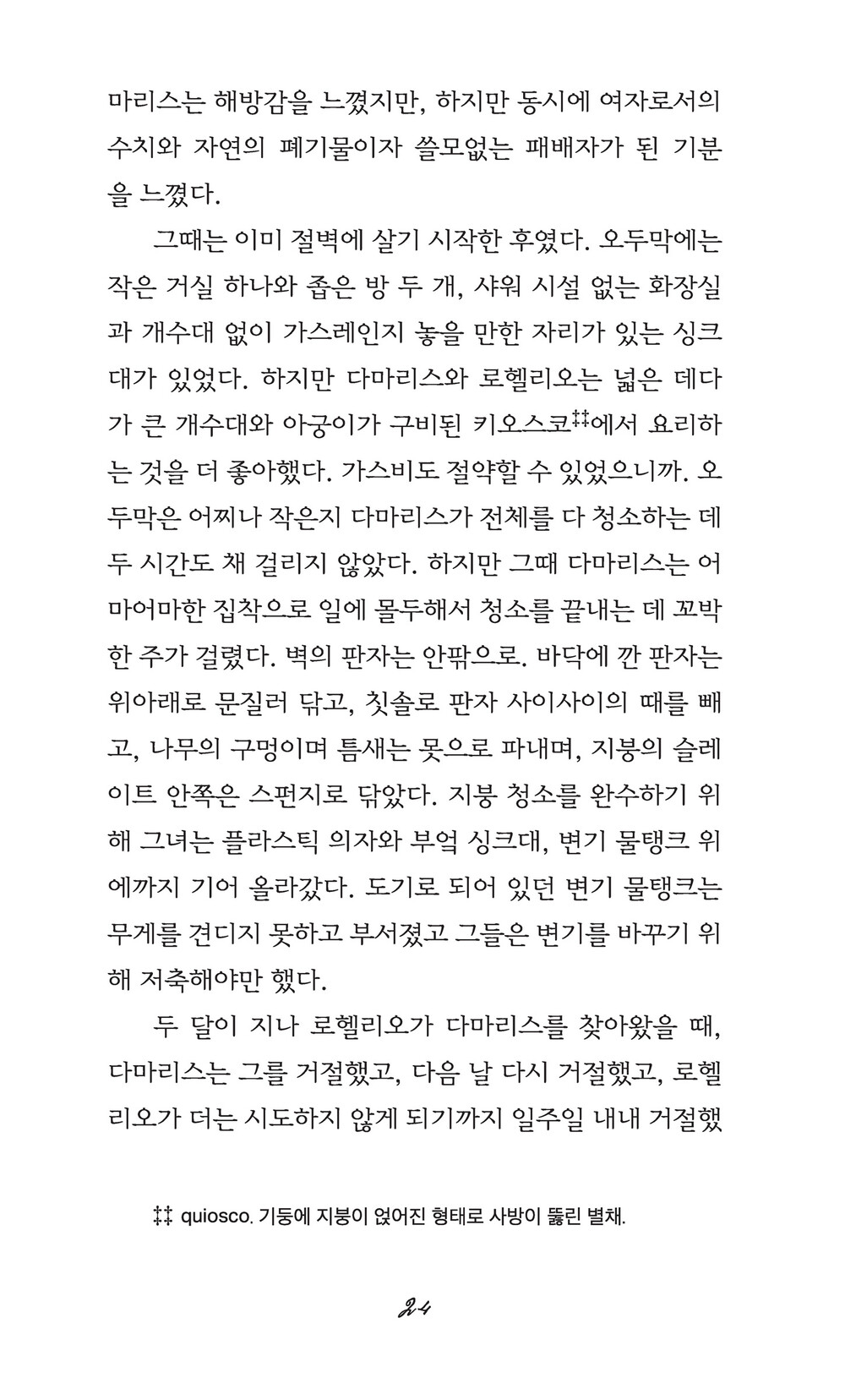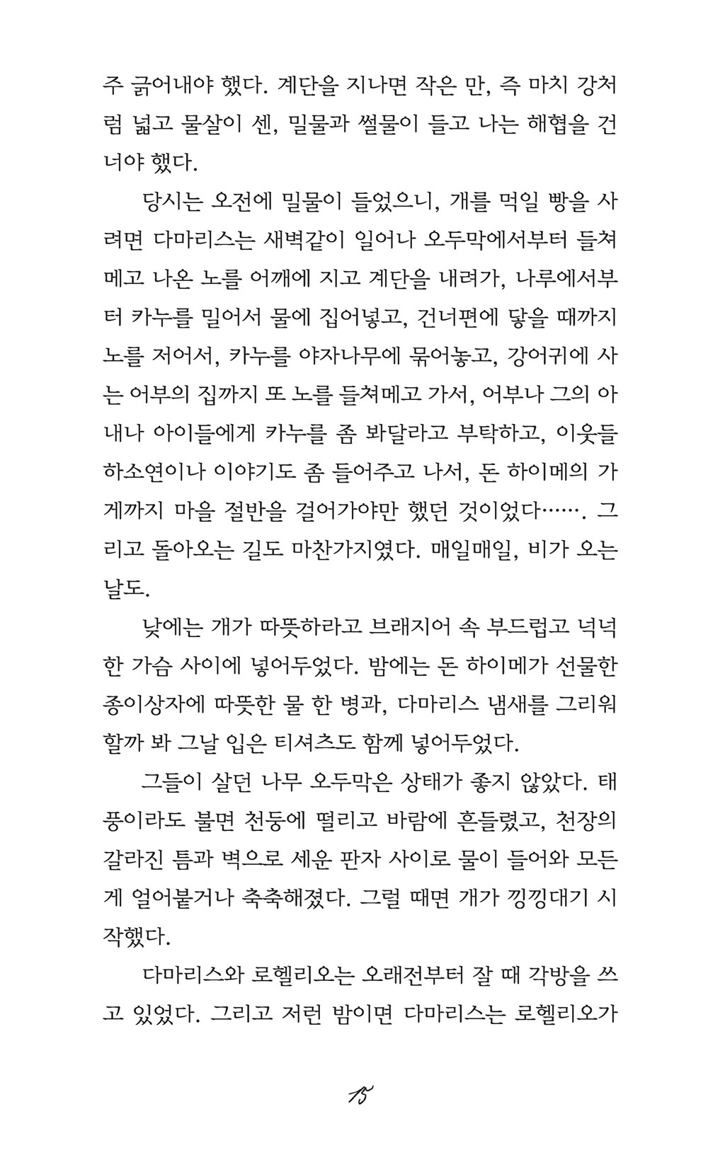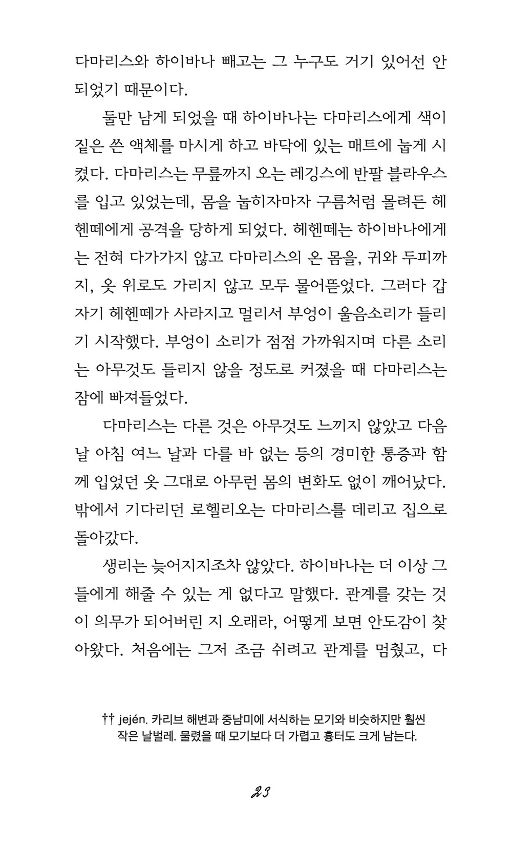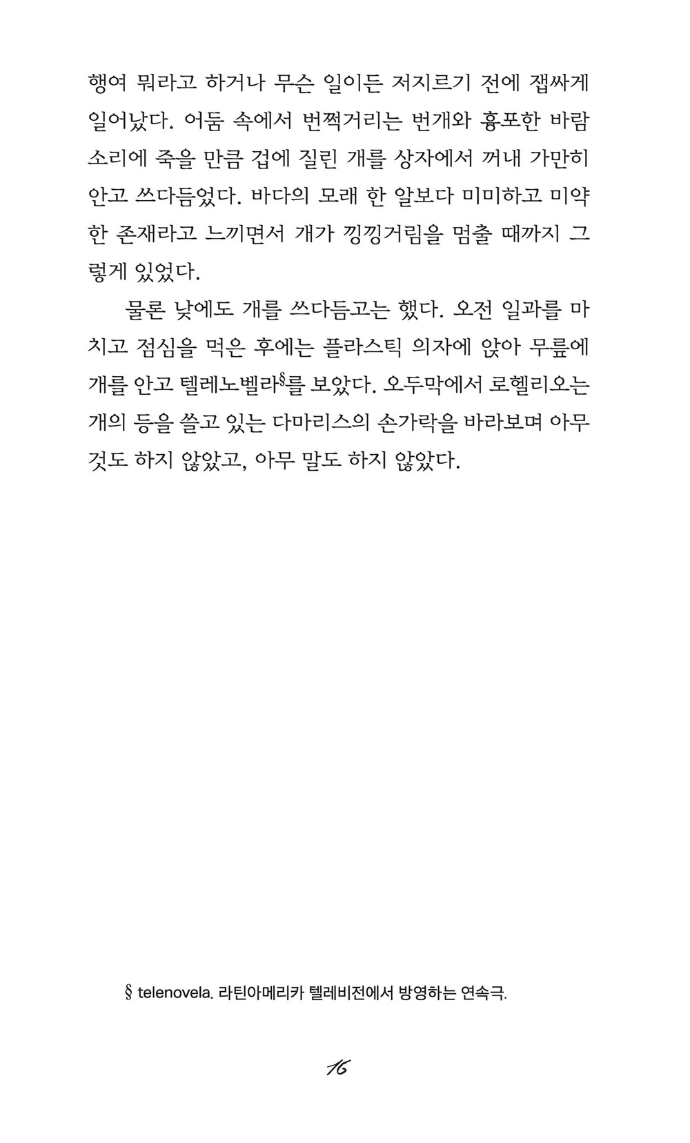 히메나는 개를 돌보지 않았고, 개는 다시 새끼를 뱄고, 계속해서 도망갔을 것이고 아무리 다마리스가 많이 되돌려놓는다 해도 상관없이 자기 집이라고 생각하는 곳으로 돌아왔을 것이었다. 키오스코에서 결국 새끼를 낳았을 것이고 또다시 다마리스는 강아지들을 책임져야만 했을 것이다. 개는 이미 나쁜 엄마임이 입증되었으니, 개들을 또 버려두었을 것이고, 이번에는 몇 마리나 태어났을지 누가 알 것이며, 그중에 아무도 원하지 않을 암컷은 도대체 몇 마리였을 것인가. 그렇다면 이번에는 정말로 다마리스가 새끼들을 바다에 던지게 될 것이며, 그건 죽이는 것과 매한가지고, 한 마리로 다 해결될 일을, 여러 마리를 죽이게 되는 셈이니까. — 109-110 pp