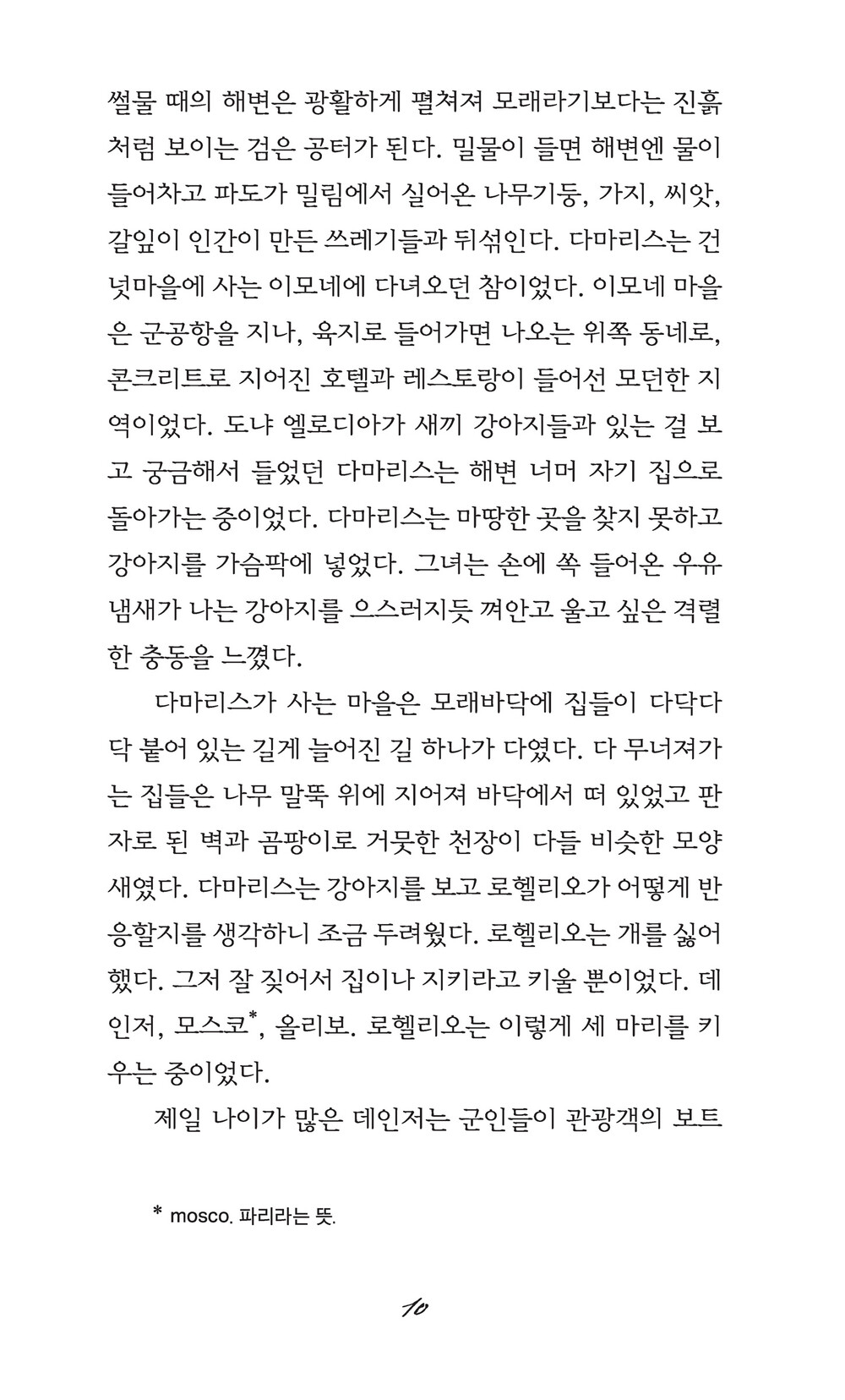 썰물 때의 해변은 광활하게 펼쳐져 모래라기보다는 진흙처럼 보이는 검은 공터가 된다. 밀물이 들면 해변엔 물이 들어차고 파도가 밀림에서 실어온 나무기둥, 가지, 씨앗, 갈잎이 인간이 만든 쓰레기들과 뒤섞인다. 다마리스는 건넛마을에 사는 이모네에 다녀오던 참이었다. 이모네 마을은 군공항을 지나, 육지로 들어가면 나오는 위쪽 동네로, 콘크리트로 지어진 호텔과 레스토랑이 들어선 모던한 지역이었다. 도냐 엘로디아가 새끼 강아지들과 있는 걸 보고 궁금해서 들었던 다마리스는 해변 너머 자기 집으로 돌아가는 중이었다. 다마리스는 마땅한 곳을 찾지 못하고 강아지를 가슴팍에 넣었다. 그녀는 손에 쏙 들어온 우유 냄새가 나는 강아지를 으스러지듯 껴안고 울고 싶은 격렬한 충동을 느꼈다. — 10 p