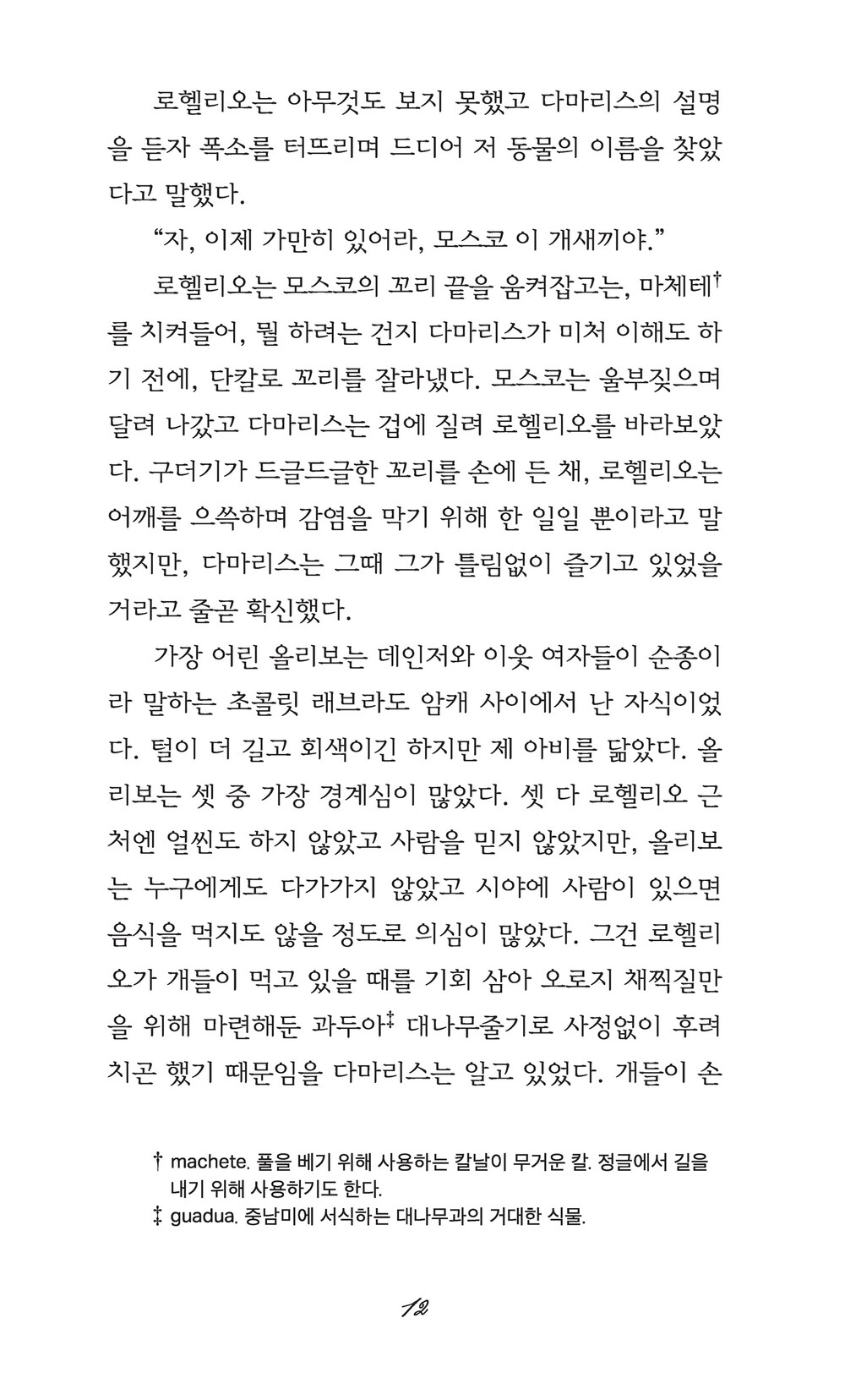 다마리스는 강아지들이 너무나 여린데 사람들이 어떻게 돌봐야 하는지를 몰랐던 거라고 스스로를 납득시키려 했지만 루스밀라의 말이 머릿속을 계속 맴돌았다. “그거 그렇게 만져대다가 죽이겠어.” 그리고 어쩌면 그녀 역시 모든 걸 잘못하고 있고 조만간 그녀의 개도 자기 남매들처럼 뻣뻣하게 굳은 채로 아침을 맞이하리라는 생각이 들었다. 첫 한 달이 지날 무렵, 열한 마리의 강아지 중 세 마리만이 남았다. 다마리스의 개, 도냐 엘로디아의 개, 건넛마을에서 수공예품을 팔아 먹고사는 예순 남짓 된 여자 히메나의 개까지. 다마리스는 그저 개가 죽지 않은 것이 놀라웠다. — 27 p