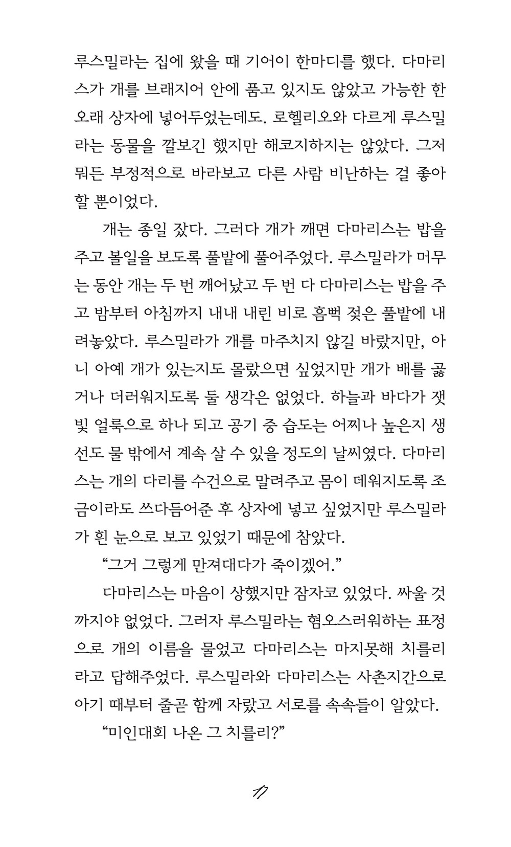 식겁한 개는 겅중 뛰어올라 다마리스를 개 특유의 혼란스러운, 아니 어쩌면 잔뜩 겁먹은 눈빛으로 바라보다가, 한때는 아군이었지만 지금은 반대편에 서서 가장 큰 배신을 저지른 다마리스로부터 슬금슬금 멀어지기 시작했다. 개는 꼬리를 숨기고 뒤를 조심하면서 계속해서 고개를 돌렸고 다마리스는 이제는 정말로 둘 사이에 돌이킬 수 없는 무엇인가가 깨졌다는 인상을 받았다. 기대와는 달리, 아팠다. 개는 그녀의 것이었다. — 93 p