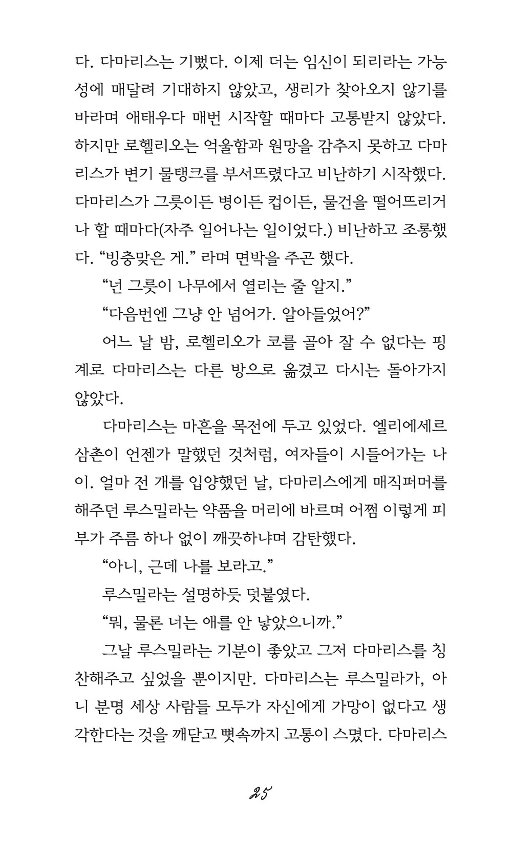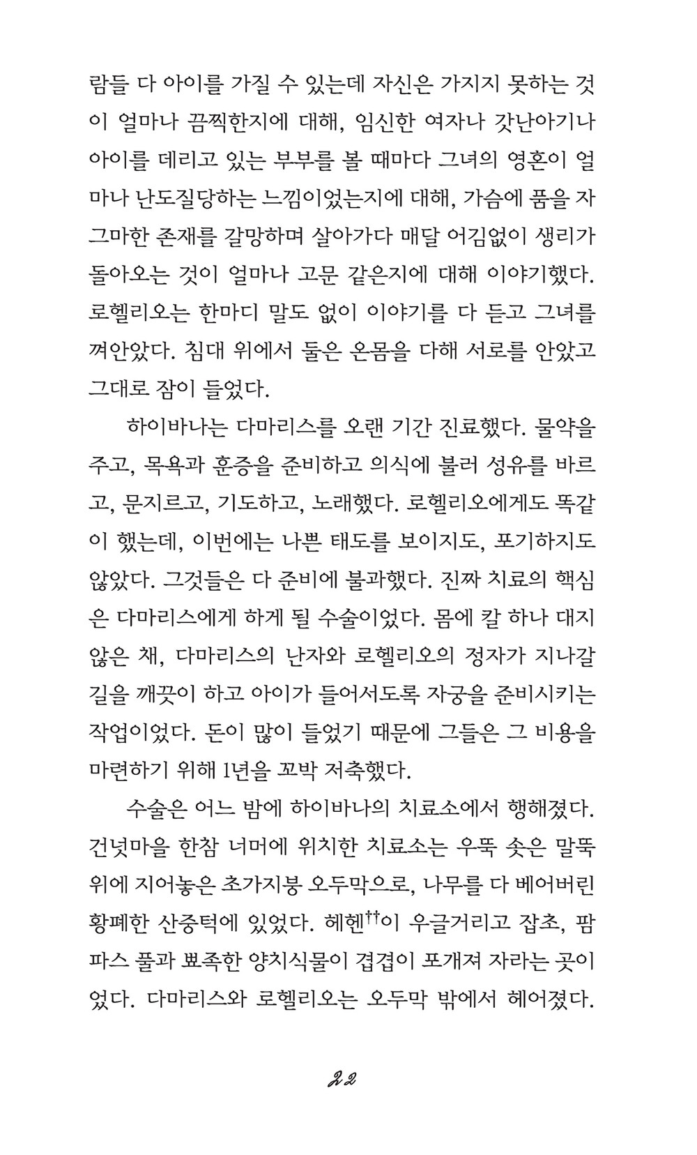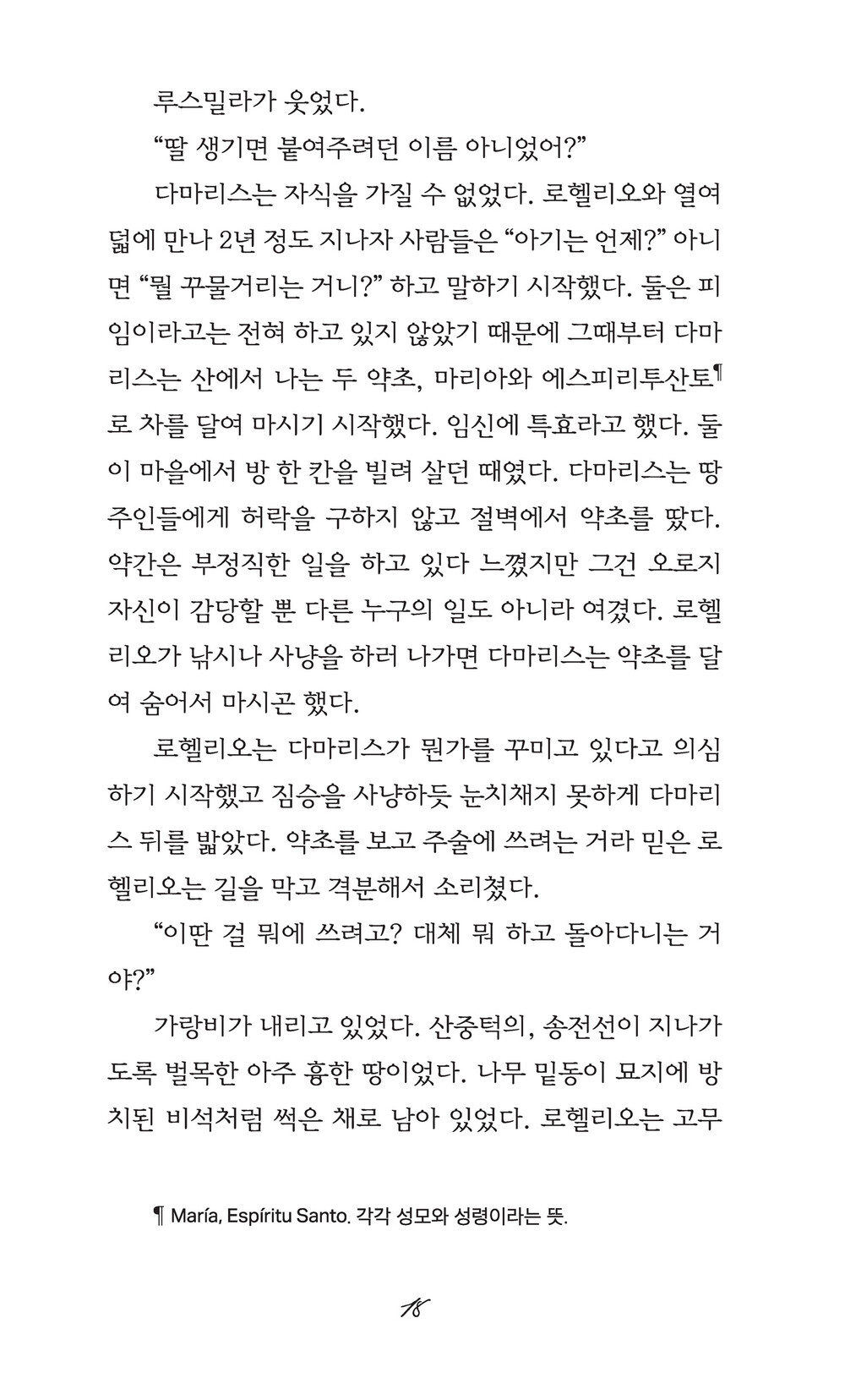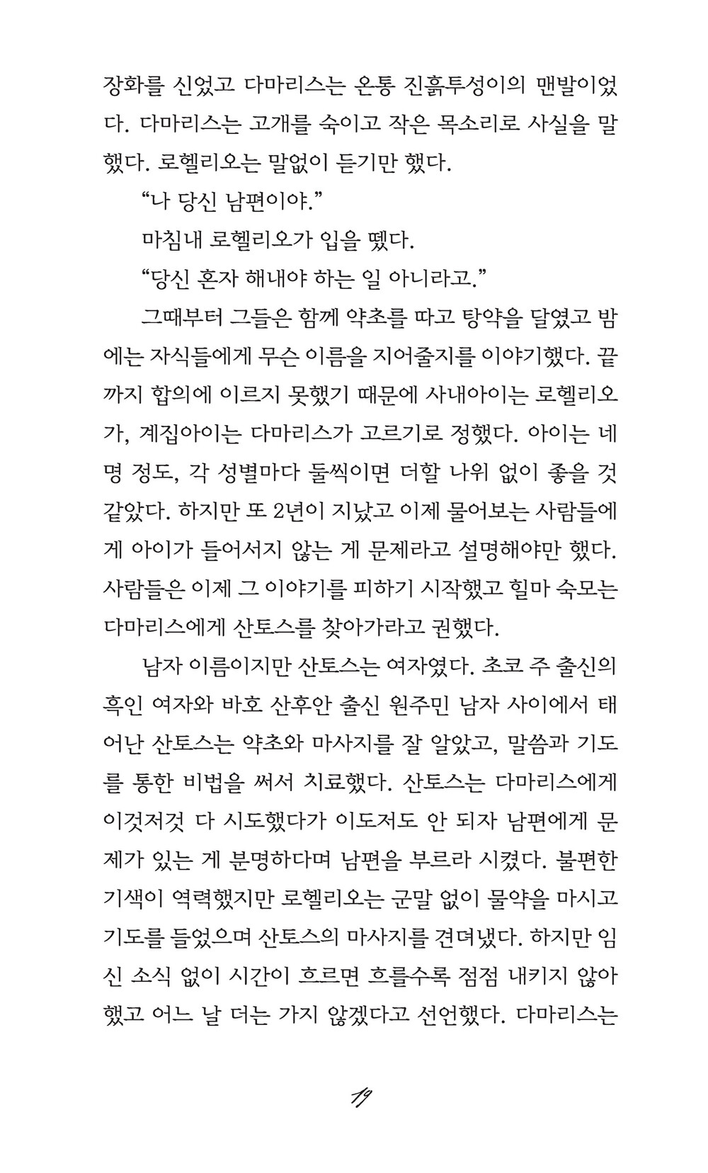 그들은 함께 약초를 따고 탕약을 달였고 밤에는 자식들에게 무슨 이름을 지어줄지를 이야기했다. 끝까지 합의에 이르지 못했기 때문에 사내아이는 로헬리오가, 계집아이는 다마리스가 고르기로 정했다. 아이는 네 명 정도, 각 성별마다 둘씩이면 더할 나위 없이 좋을 것 같았다. 하지만 또 2년이 지났고 이제 물어보는 사람들에게 아이가 들어서지 않는 게 문제라고 설명해야만 했다. — 19 p