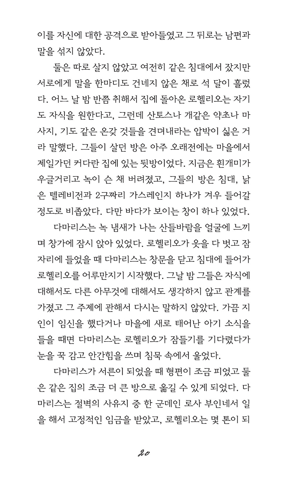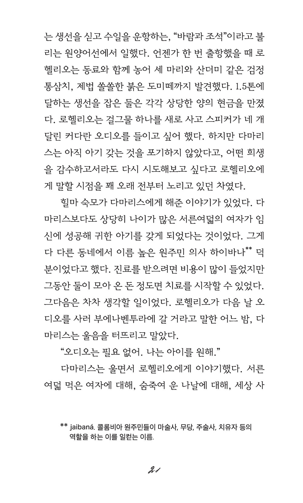 로헬리오가 다음 날 오디오를 사러 부에나벤투라에 갈 거라고 말한 어느 밤, 다마리스는 울음을 터뜨리고 말았다. “오디오는 필요 없어. 나는 아이를 원해.” 다마리스는 울면서 로헬리오에게 이야기했다. 서른여덟 먹은 여자에 대해, 숨죽여 운 나날에 대해, 세상 사람들 다 아이를 가질 수 있는데 자신은 가지지 못하는 것 이 얼마나 끔찍한지에 대해, 임신한 여자나 갓난아기나 아이를 데리고 있는 부부를 볼 때마다 그녀의 영혼이 얼마나 난도질당하는 느낌이었는지에 대해, 가슴에 품을 자그마한 존재를 갈망하며 살아가다 매달 어김없이 생리가 돌아오는 것이 얼마나 고문 같은지에 대해 이야기했다. 로헬리오는 한마디 말도 없이 이야기를 다 듣고 그녀를 껴안았다. — 21-22 pp