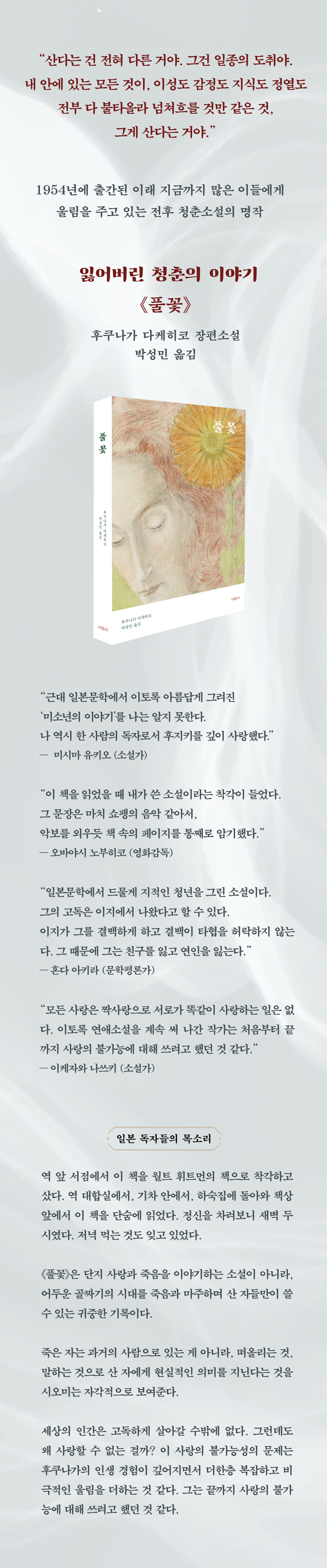 “<풀꽃>은 일본문학에서 드물게 지적인 청년을 그린 소설이다. 이 청년의 고독은 이지에서 나왔다고 할 수 있다. 이지가 그를 결백하게 하고 결백이 타협을 허락하지 않는다. 그 때문에 그는 친구를 잃고 연인을 잃는다.” - 혼다 아키라 (문학평론가)