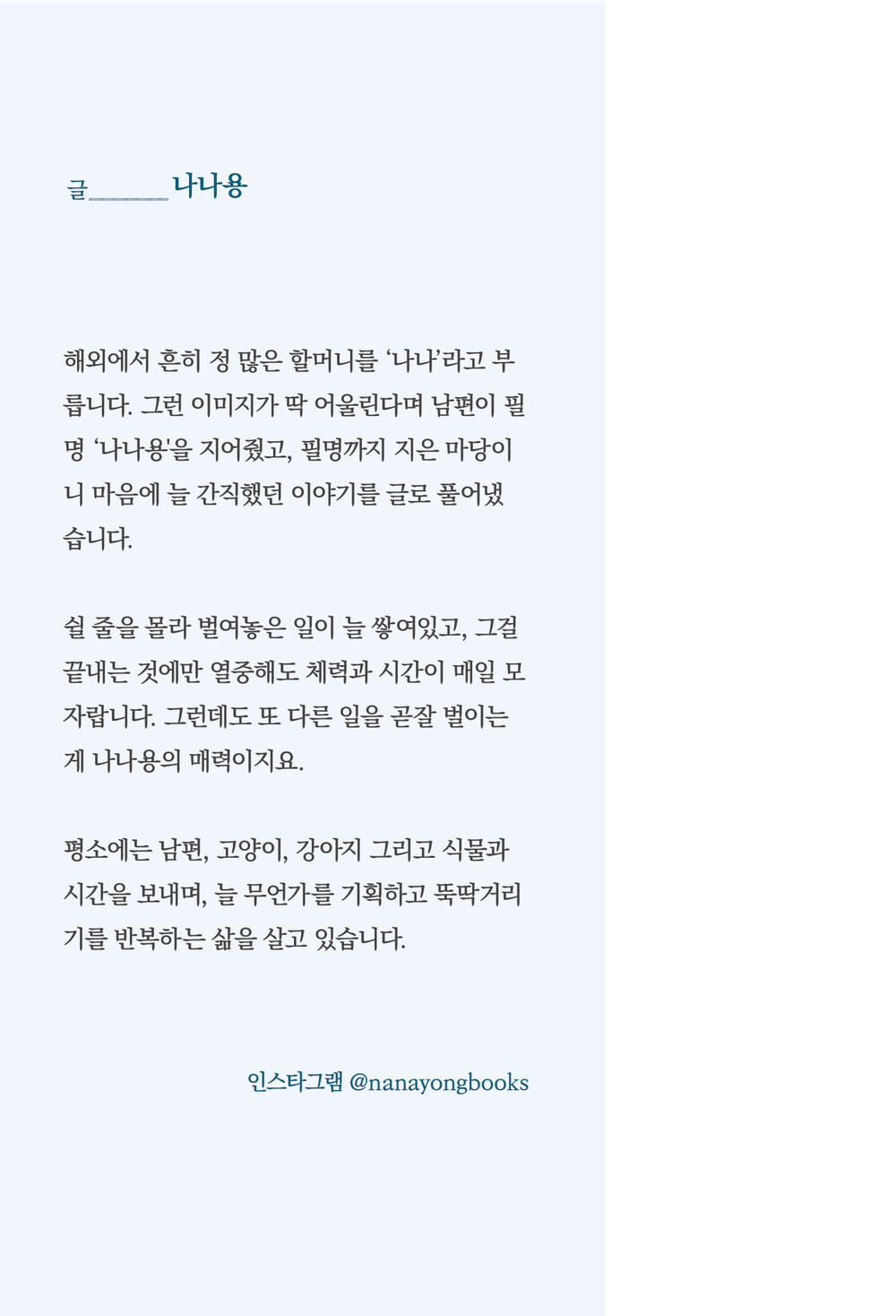현재는 작가 그리고 독립출판사 나나용북스의 대표로 활동 중이다. 저서로는 <엎지른 물이 내 마음에 담긴다>와 <나도 별이 되겠지>가 있으며, 번역서로는 <개다운 하루>가 있다.