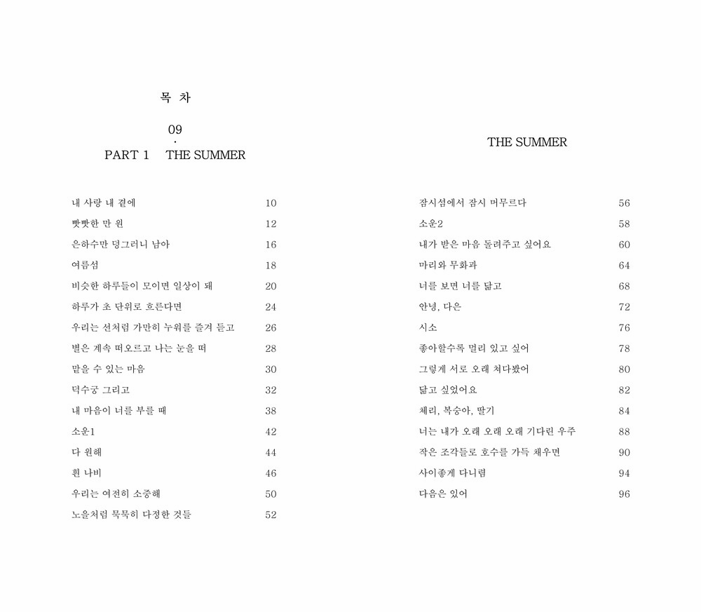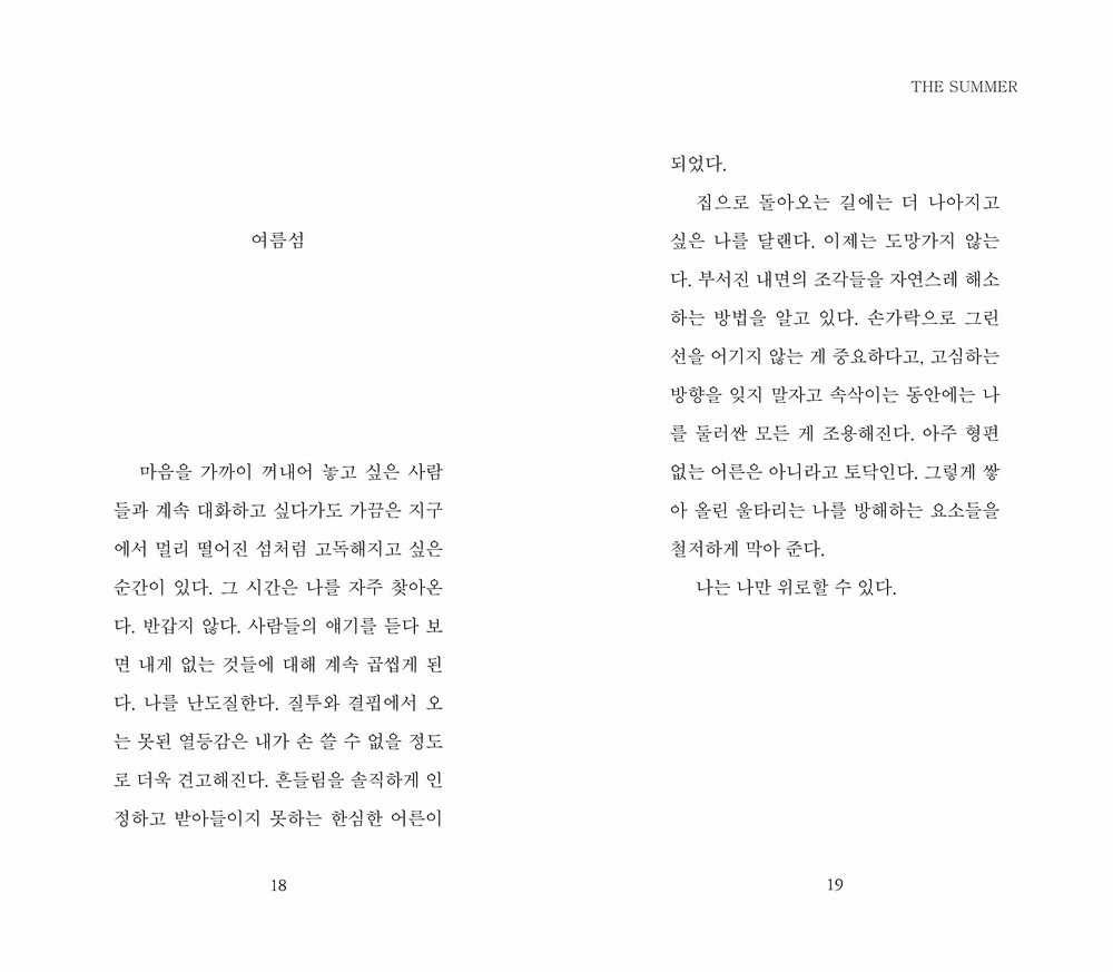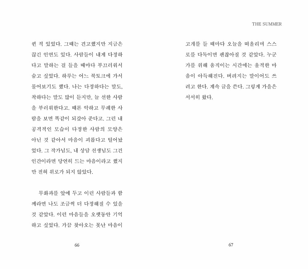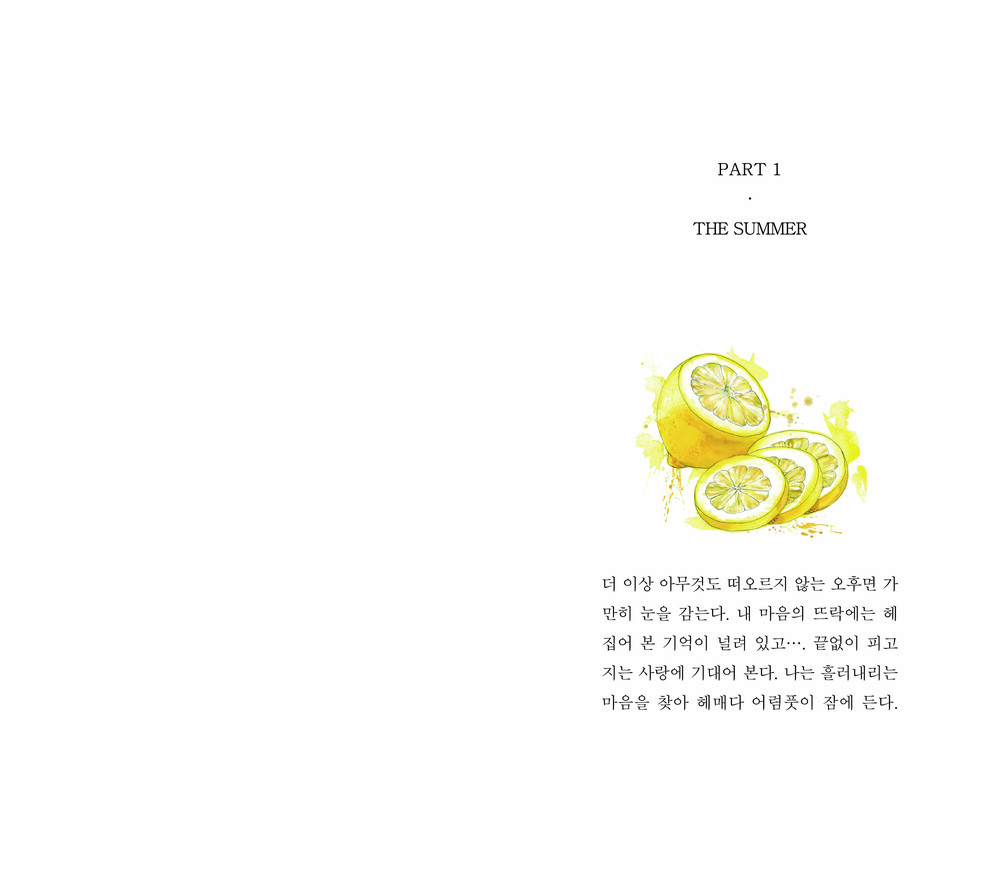 여름, THE SUMMER/ 더 이상 아무것도 떠오르지 않는 오후면 가만히 눈을 감는다. 내 마음의 뜨락에는 헤집어 본 기억이 널려 있고…. 끝없이 피고 지는 사랑에 기대어 본다. 나는 흘러내리는 마음을 찾아 헤매다 어렴풋이 잠에 든다.