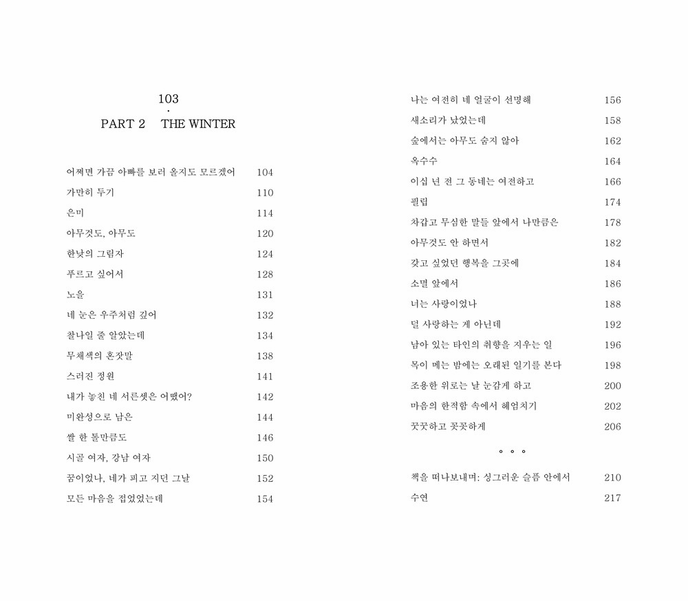 겨울, THE WINTER/ 목마르게 원망하고 싶었다. 그 마음 앞에서 지고 싶지 않아서 오래된 말을 자꾸 꺼내야 했다. 그래야만 다음 글을 쓸 수 있었다. 지나간 표정을 모을 때면 사늘히 식은 바람이 되살아났다. 그럴수록 더 마음껏 원망하고 싶었다.