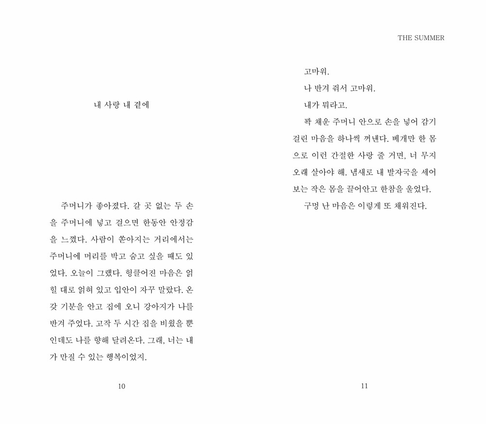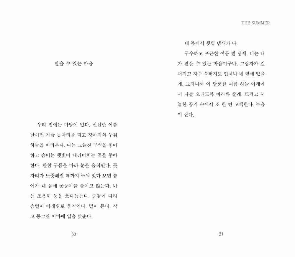 구수하고 포근한 여름 볕 냄새. 너는 내가 맡을 수 있는 마음이구나. 그림자가 길어지고 자주 슬퍼져도 언제나 네 옆에 있을게.